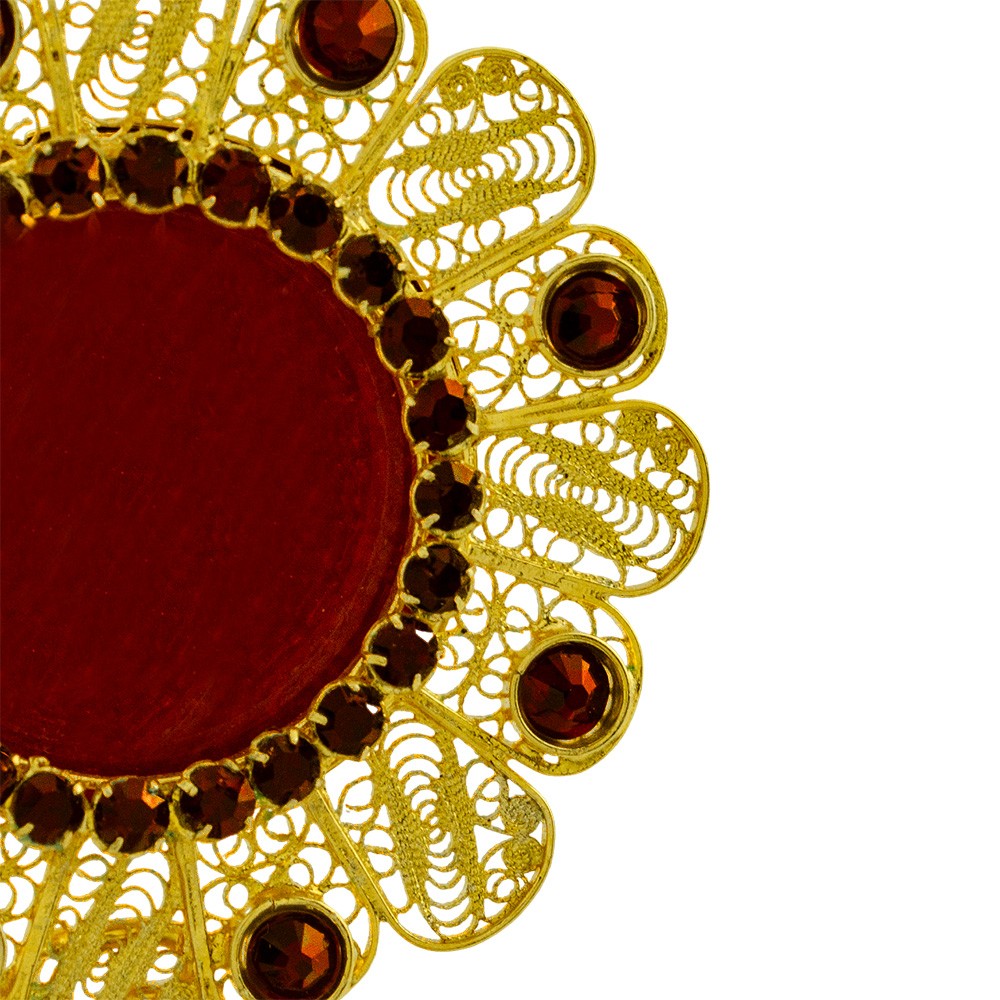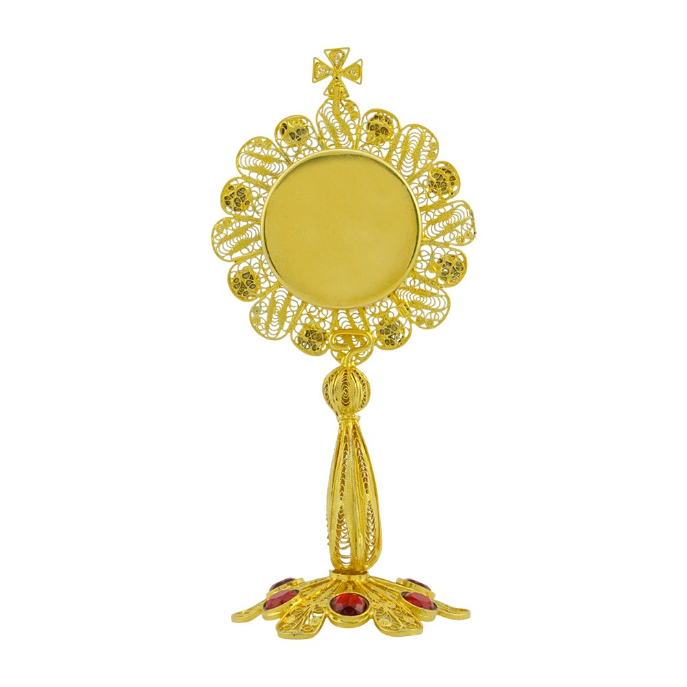 Il porta reliquie è interamente lavorato a mano da esperti artigiani italiani, eseguita con lavorazione in argento e arricchita con decori in filigrana e strass di colore rosso.
