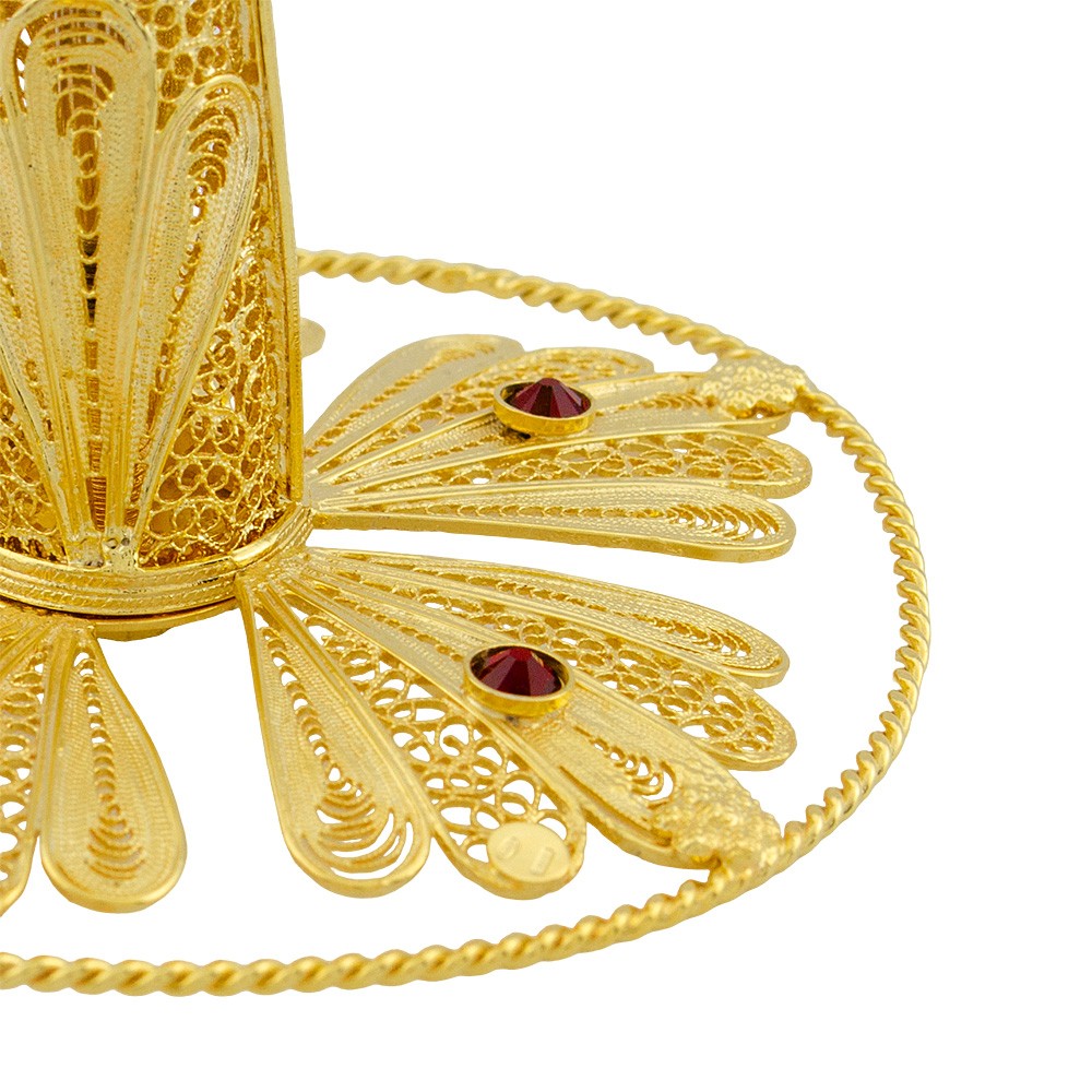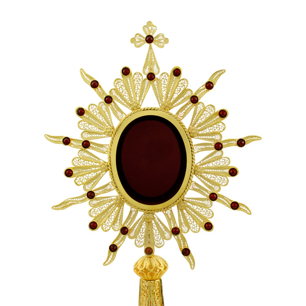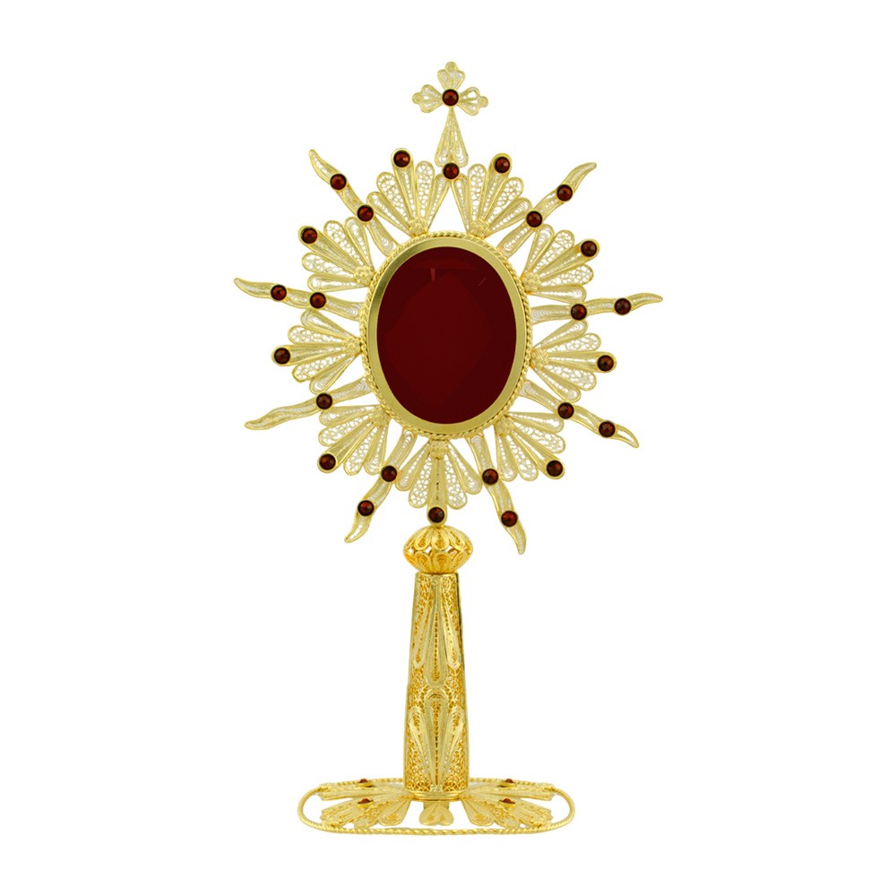 Meraviglioso reliquiario lavorato interamente a mano da esperti artigiani italiani, eseguita con lavorazione in argento 800 e arricchita con decori in filigrana e strass di colore rosso.