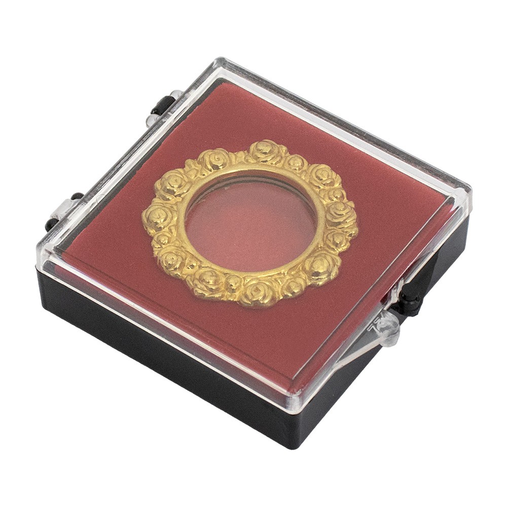 Questo reliquiario è completo di vetrino in plastica trasparente ed è corredato di scatola in plastica