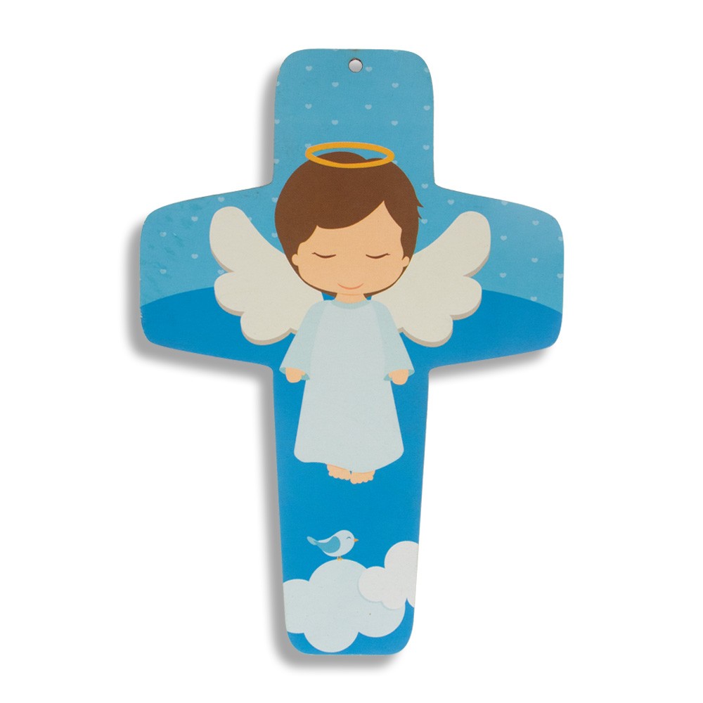 La croce è di colore blu con immagine stampata dell'angelo custode.