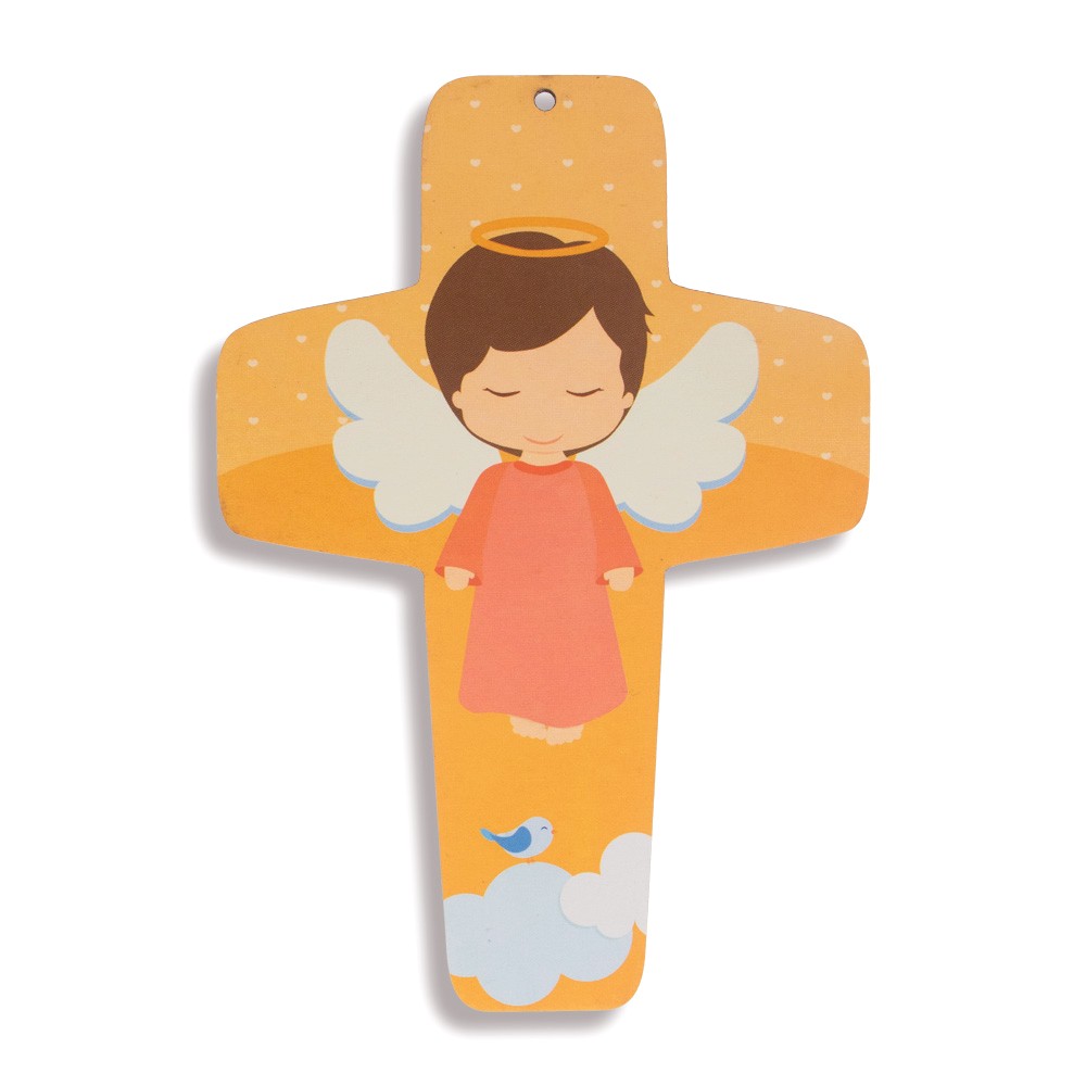 Croce Angelo di Dio di colore arancione con immagine stampata di un angioletto con ali e aureola.