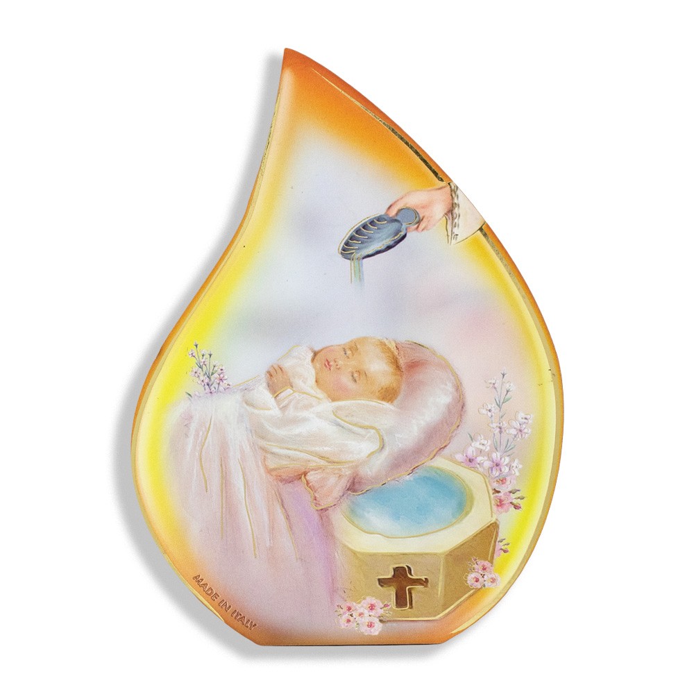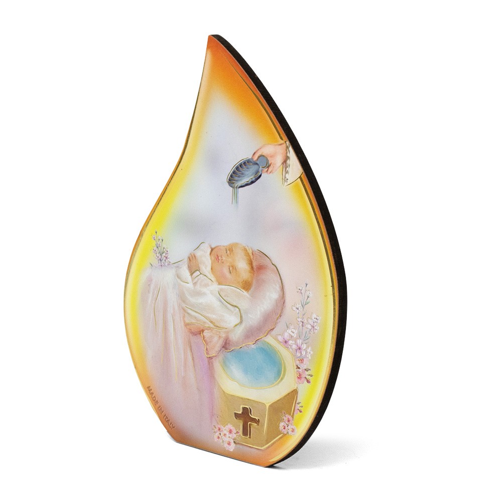 Quadretto Battesimo in legno MDF sagomato a forma di fiammella.