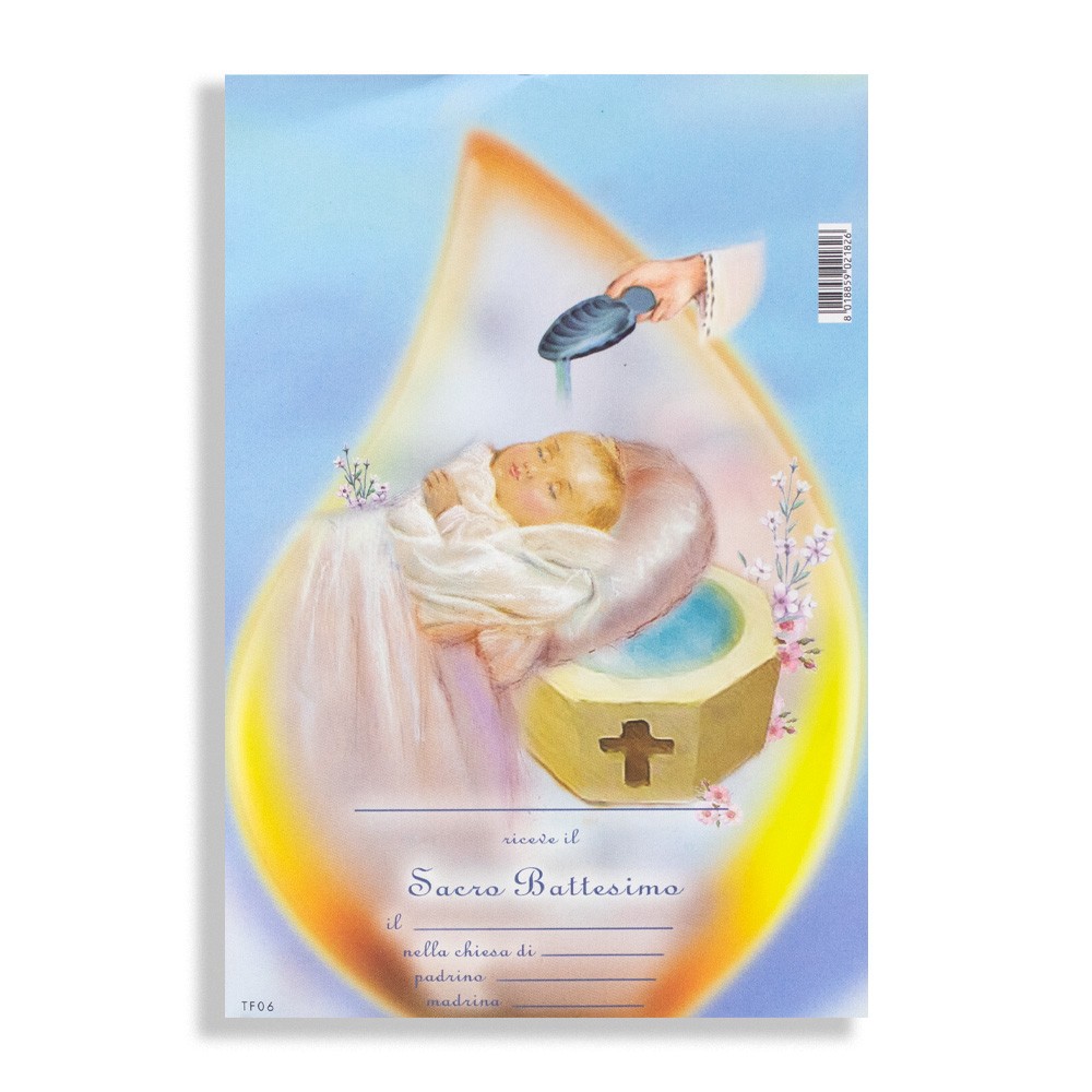 Il quadretto è corredato di piedino d'appoggio in metallo e cartoncino pergamena in ricordo del Santo Battesimo.