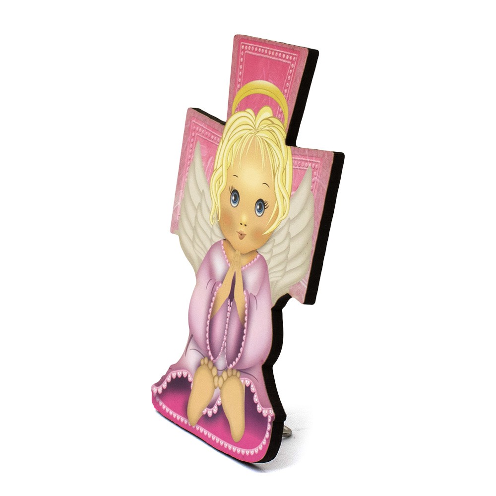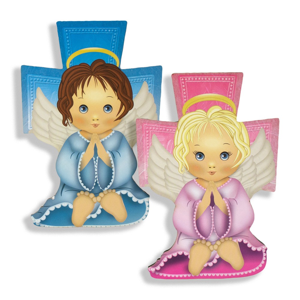 Questi graziosi quadretti sono in legno MDF a forma di croce finemente decorati con immagine di un angioletto che prega, adatto come ricordino per il Santo Battesimo.