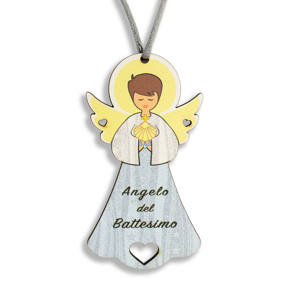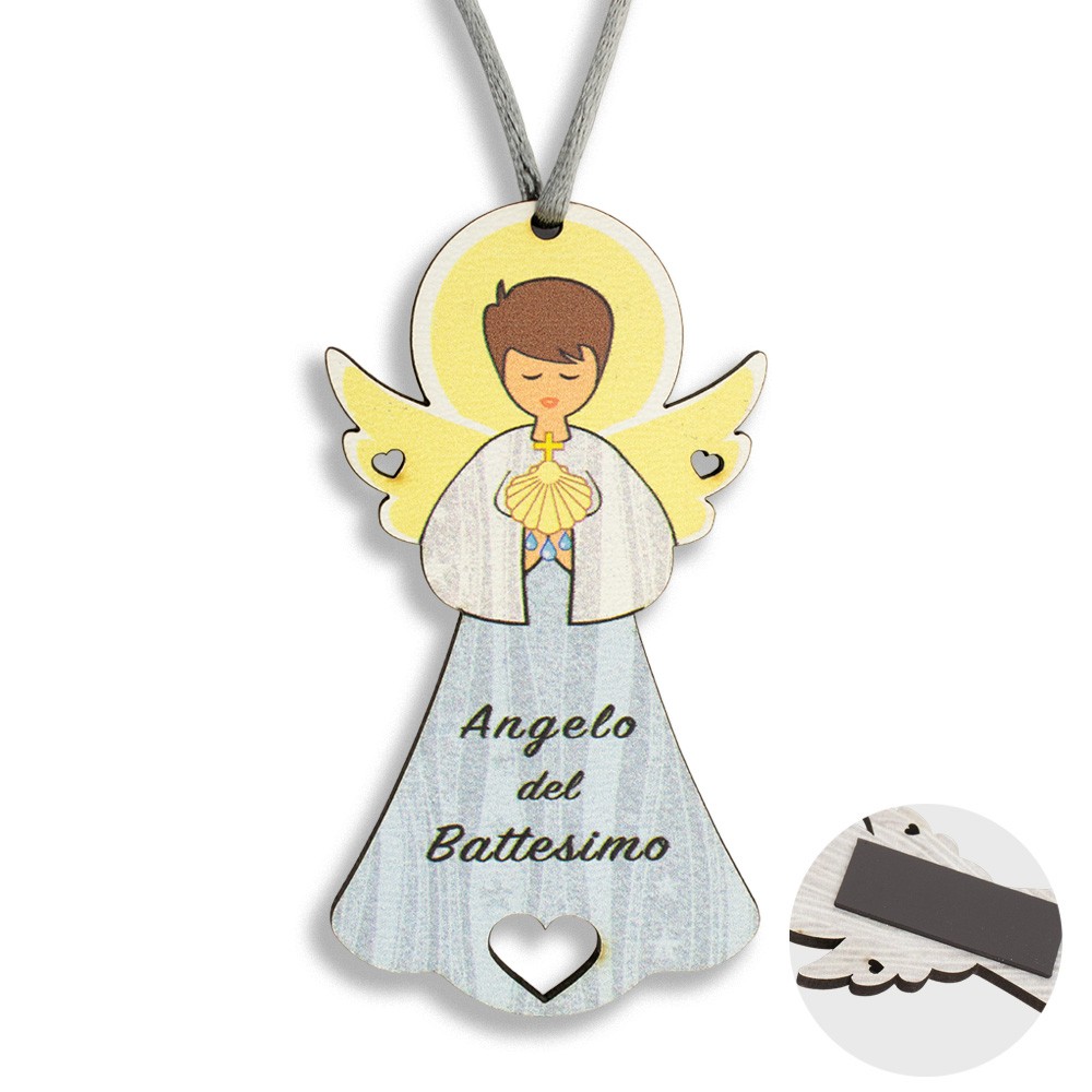 Il magnete è sagomato a forma di angioletto finemente decorato su fondo colorato e stampa "Angelo del Battesimo."