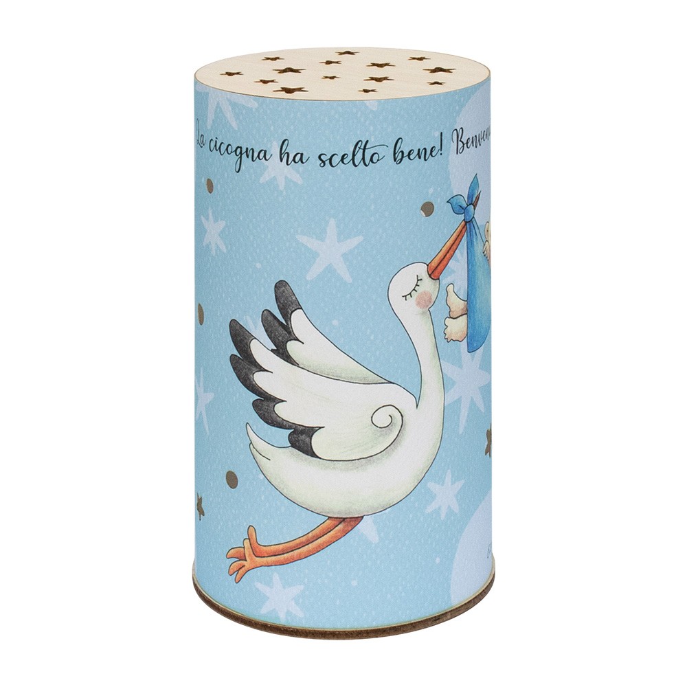 Lampada per bambini con fondo celeste e immagine della cicogna con bambino, completa di scatola regalo.