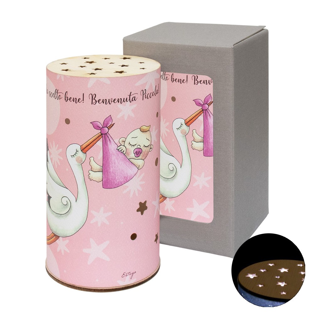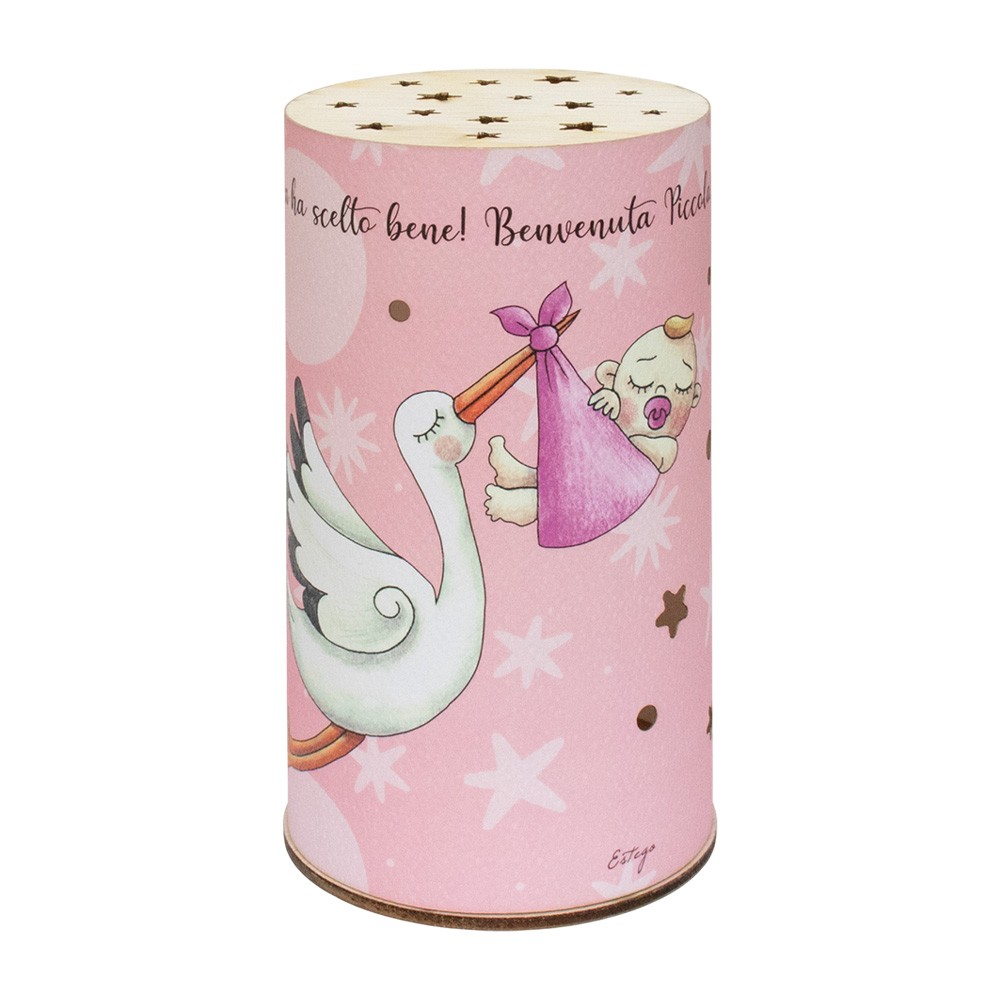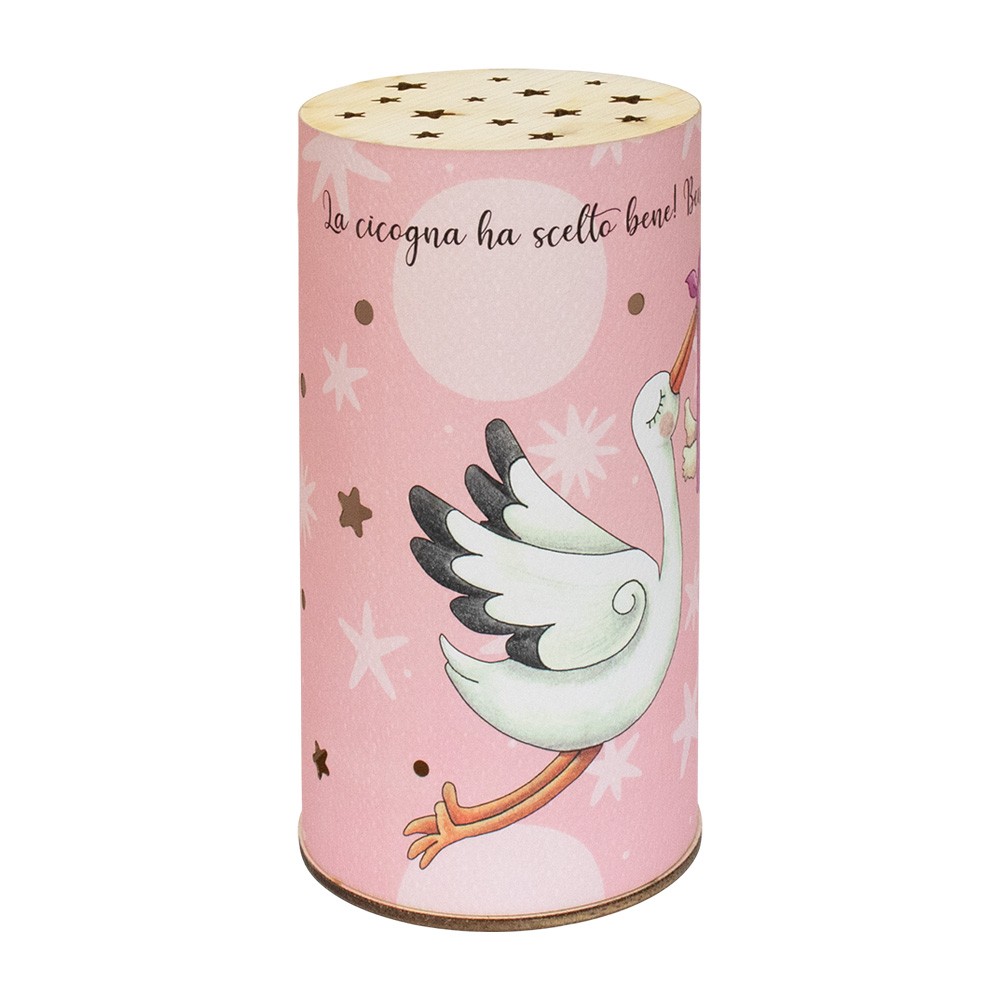 Lampada tonda per bambina con fondo rosa e immagine della cicogna, completa di scatola regalo.