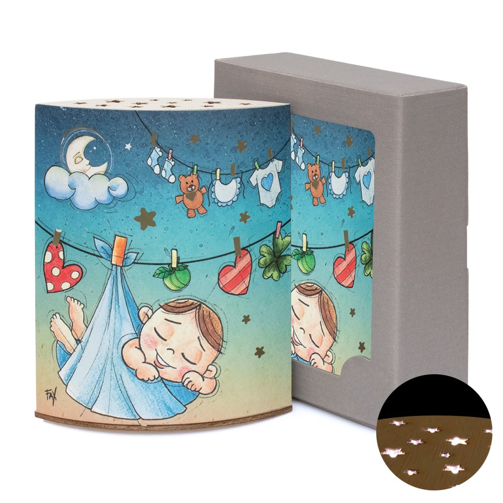 Lampada per bambini con fondo celeste e immagine della cicogna con bambino, completa di scatola regalo.