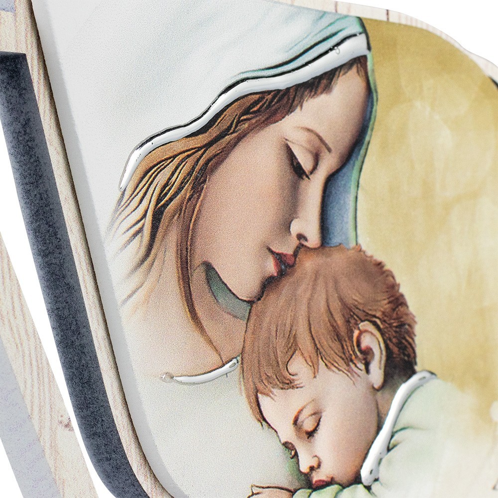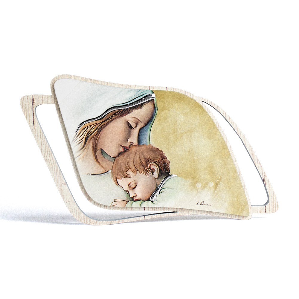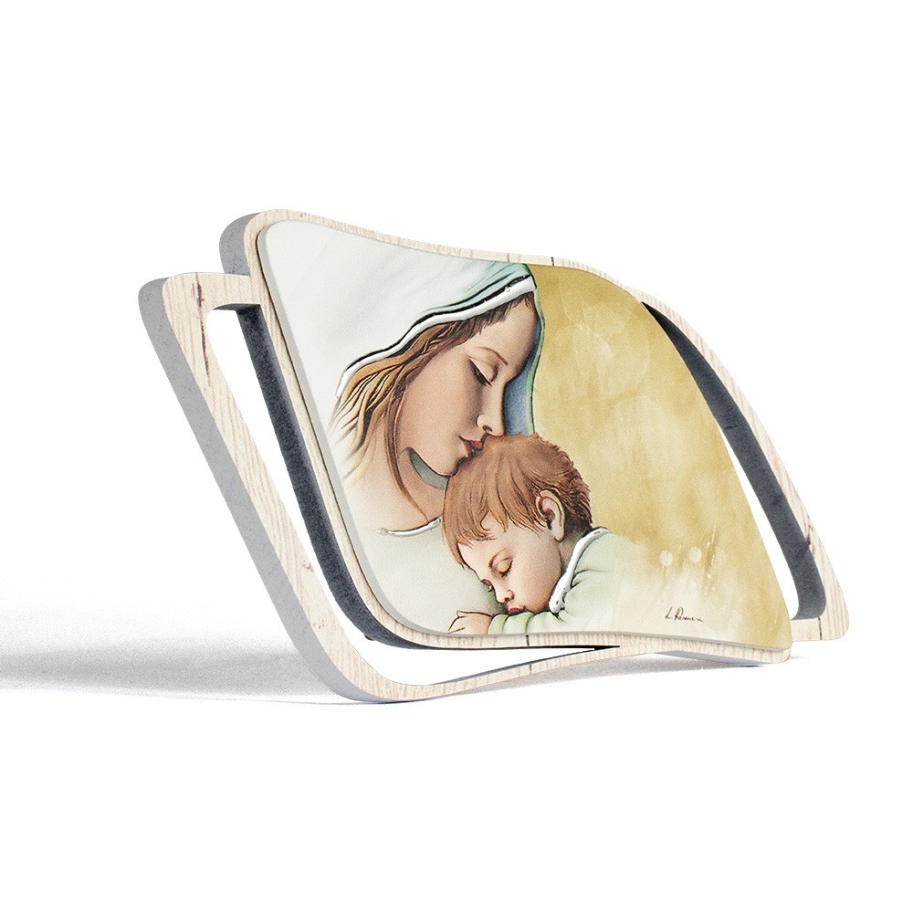 Quadretto Maternità. Realizzato in legno con immagine dipinta finemente raffigurante la Maternità, arricchito con inserti in argento laminato. Questo quadretto può essere usato d'appoggio (completo di piedino in acciaio).