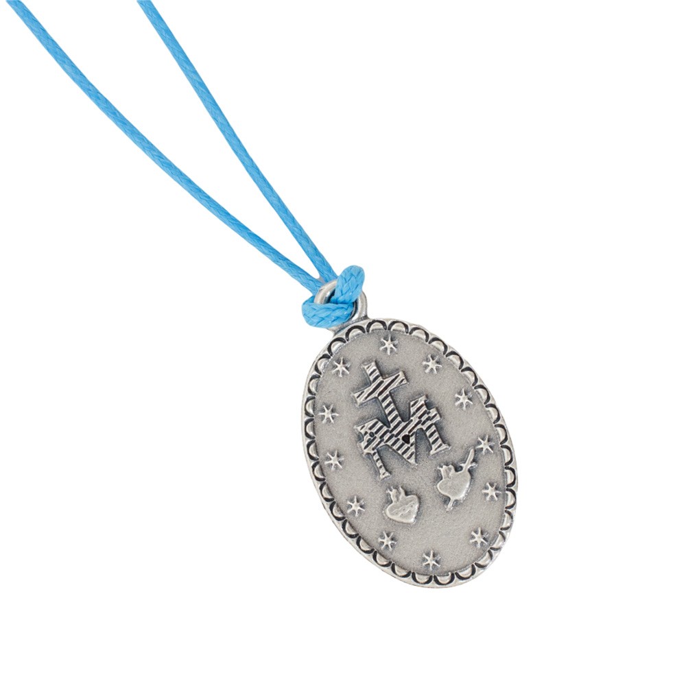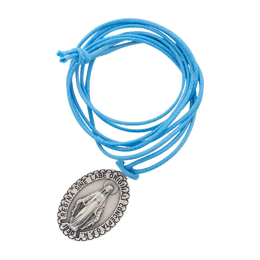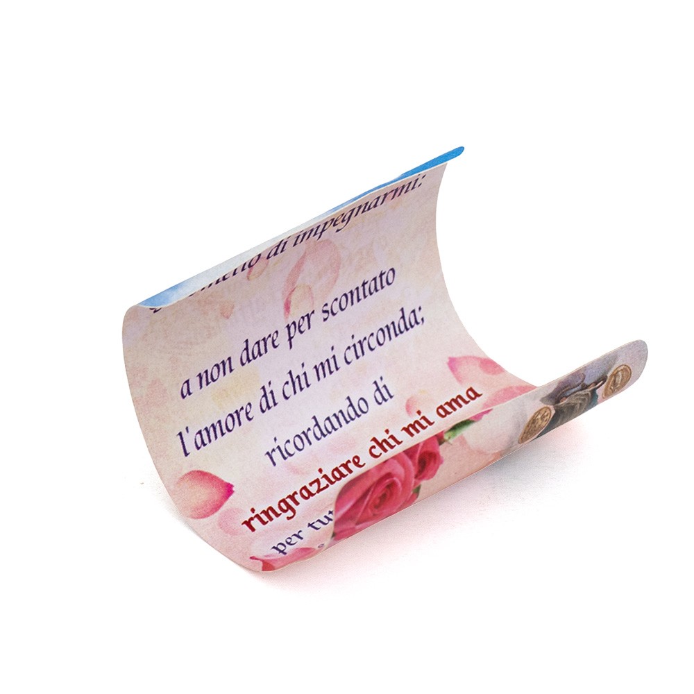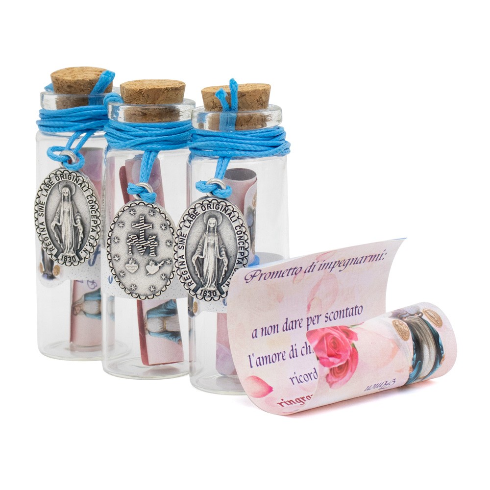 Ricordini per Sacramenti: flaconcino in vetro con messaggio e pendenti medaglia Miracolosa.