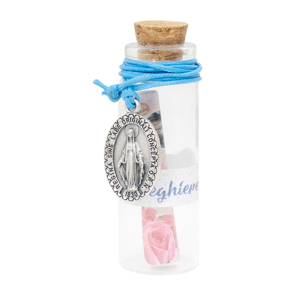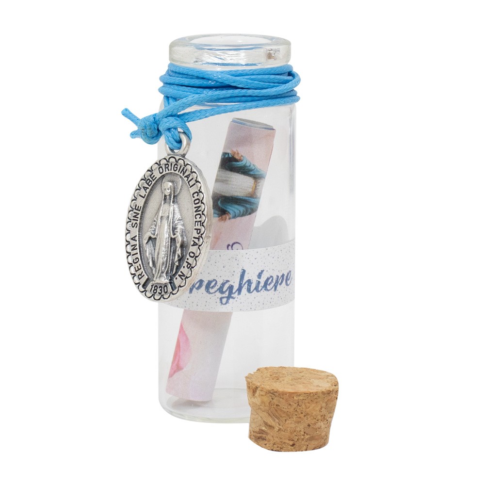 Bottiglina in vetro con messaggi assortiti e pendente medaglia Miracolosa.