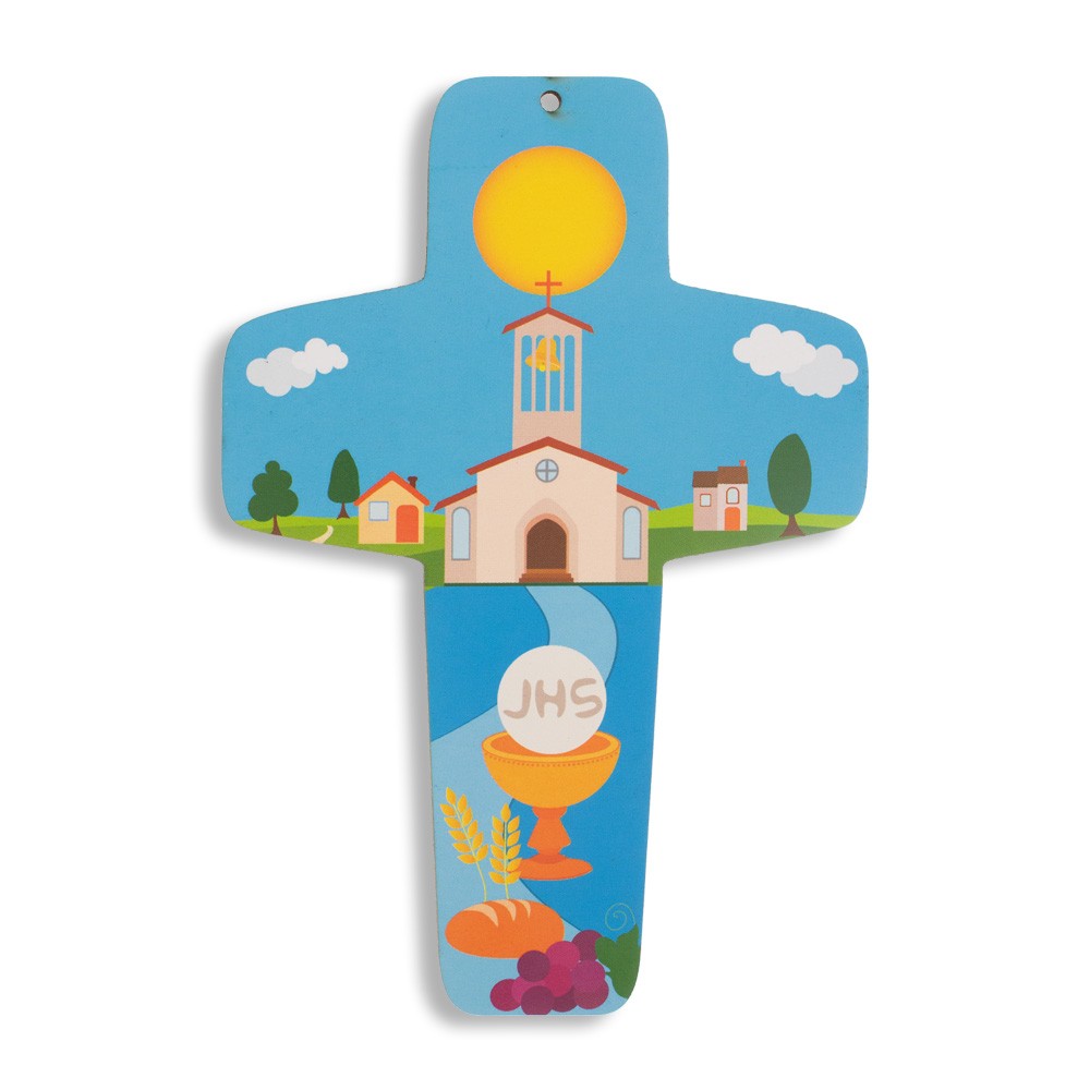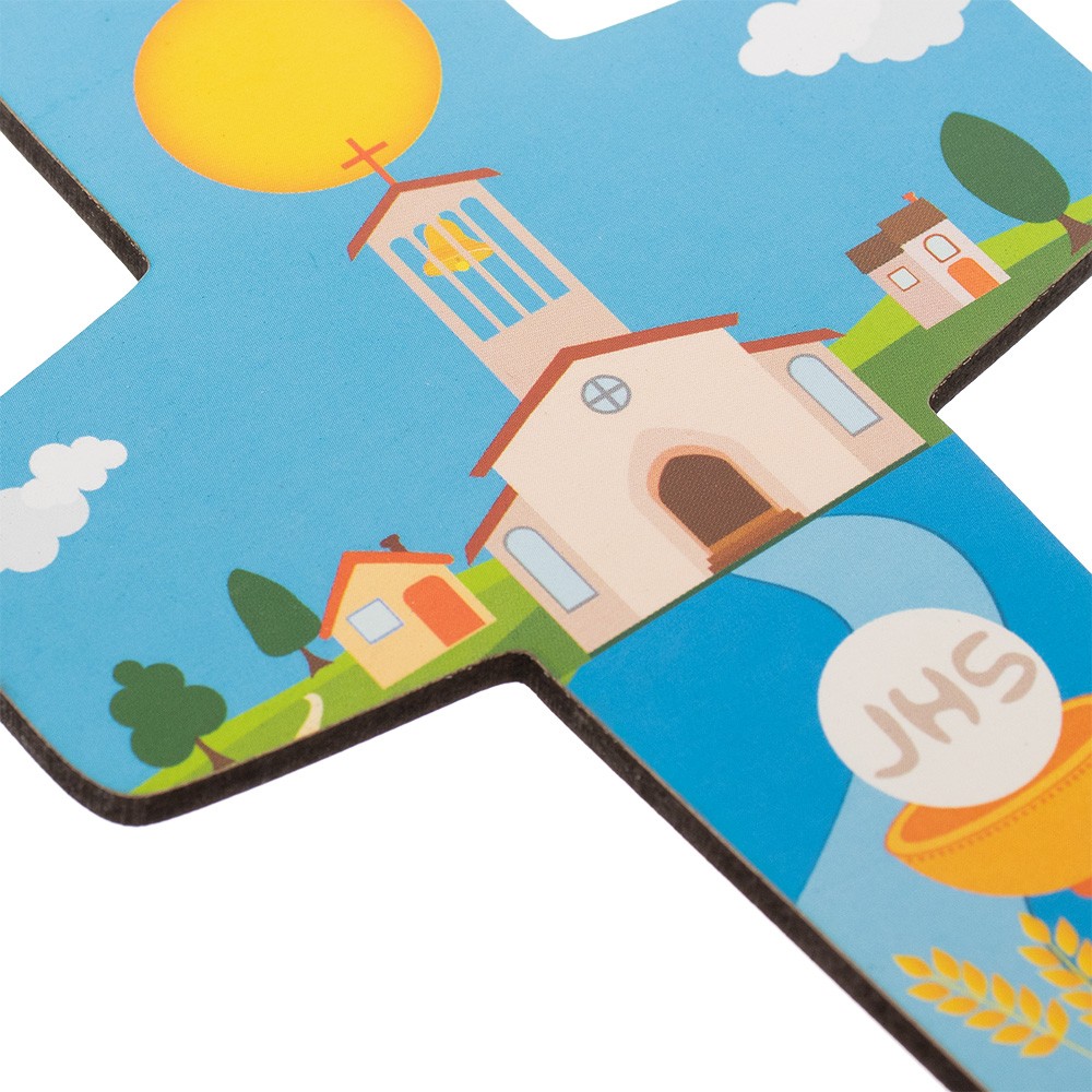 La croce è sagomata realizzata in legno (mdf) con stampa raffigurantei i simboli del Sacramento della Prima Comunione.