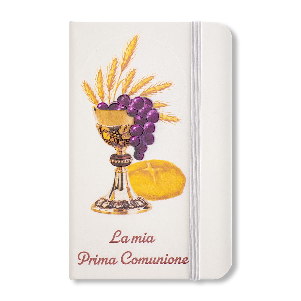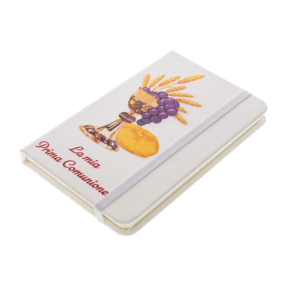 Taccuino tascabile per la Prima Comunione, con copertina bianca rigida e un pratico elastico per la chiusura.