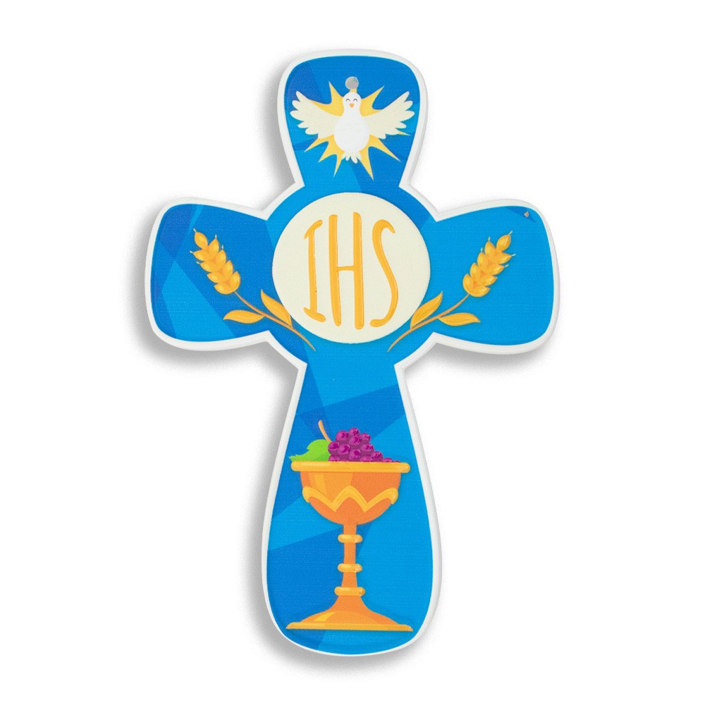 La croce è interamente in resina porcellana con dettagli in rilievo, particolare è il colore che la caratterizza con i simboli in rilievo della Prima Comunione.