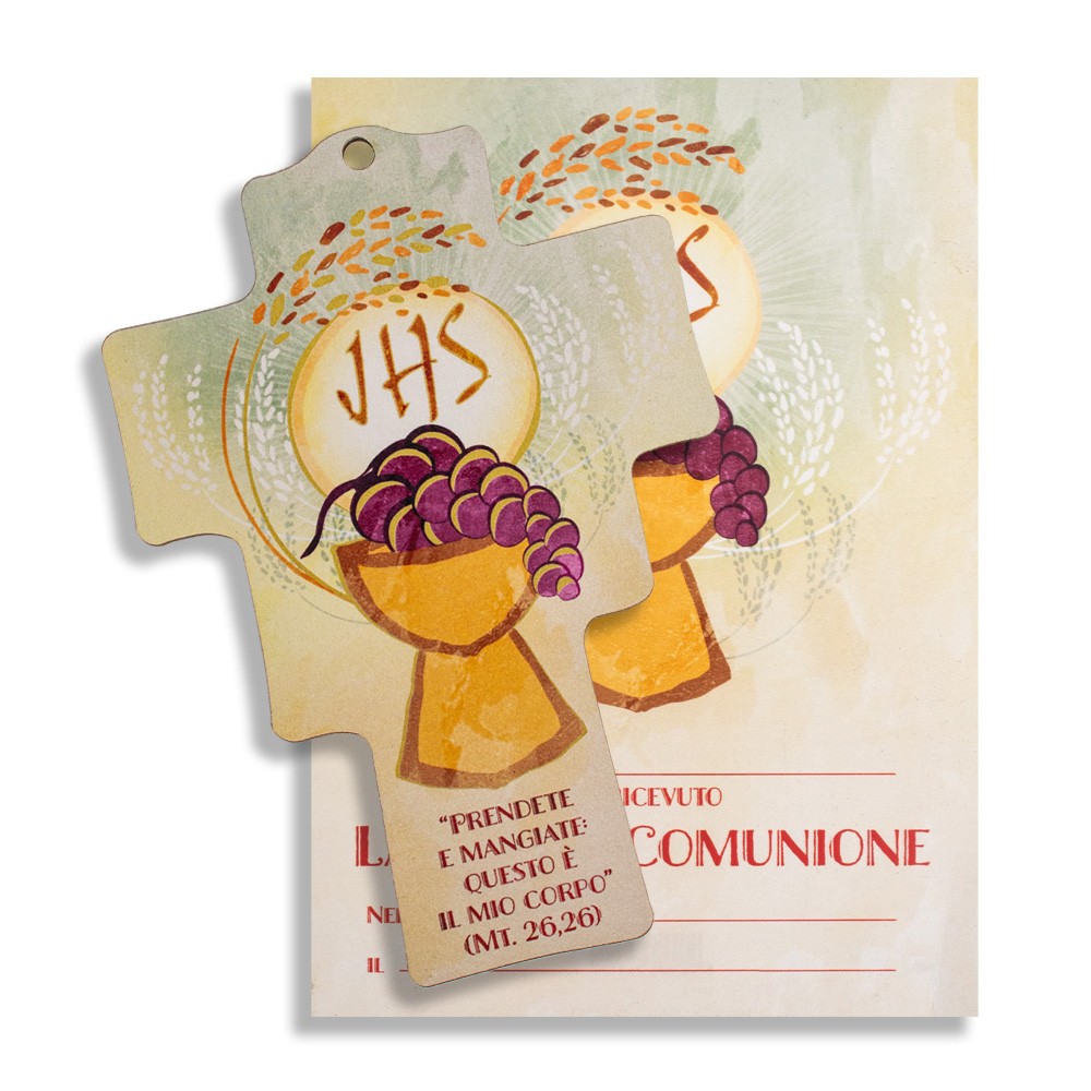 Confezione con croce in MDF e diploma ricordo Prima Comunione.
