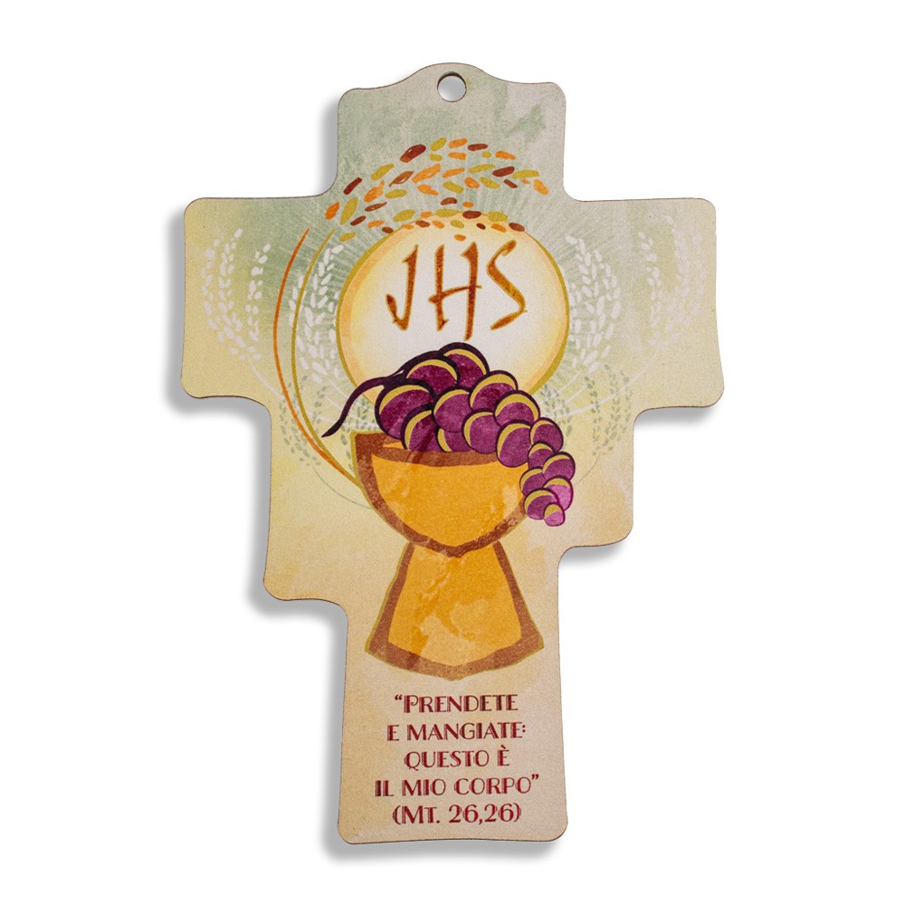 La croce è in legno MDF con stampa dei simboli eucaristici del sacramento arricchiti con dettagli dorati.