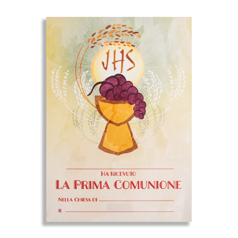 Il diploma formato 15x10,5 cm è ricordo che attesta il ricevimento del Sacramento. Sul cartoncino vi è la stessa immagine riportata sulla croce dove è possibile scrivere il luogo, la data e il nome del bambino. Il tutto confezionato in una bustina trasparente.