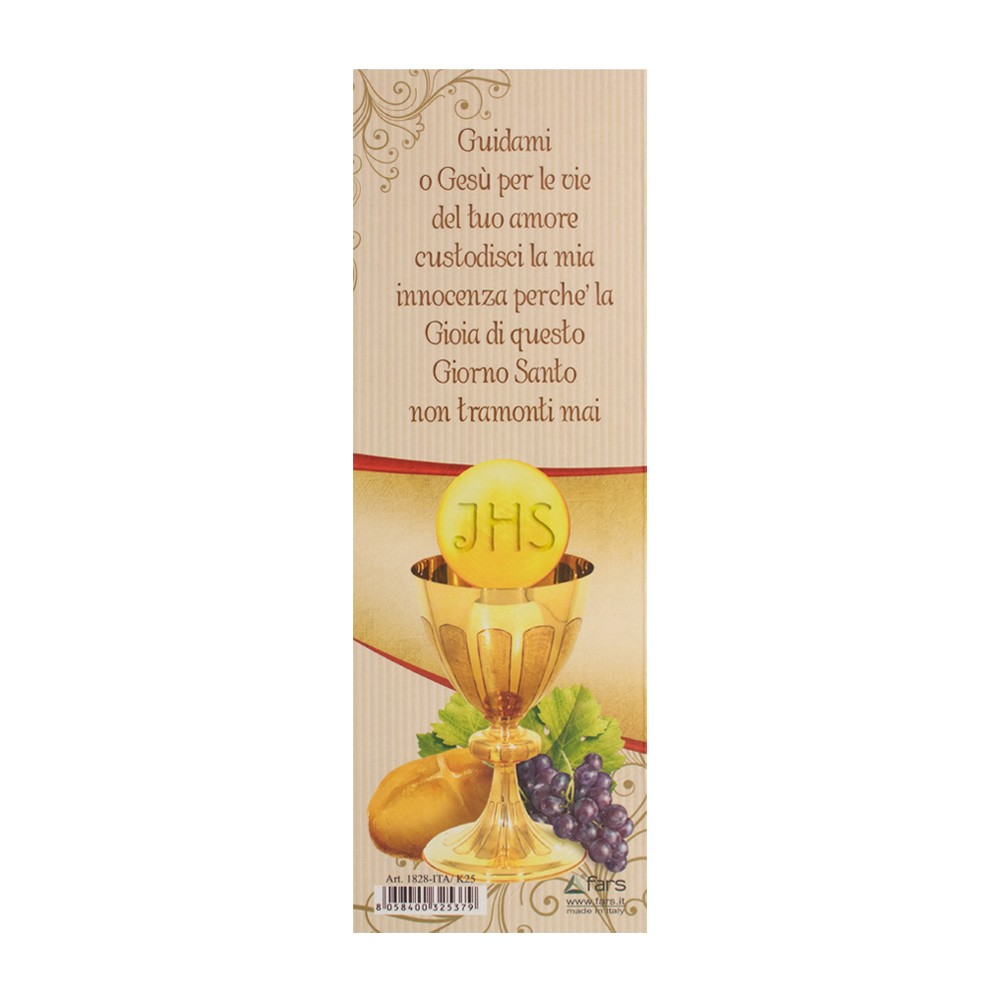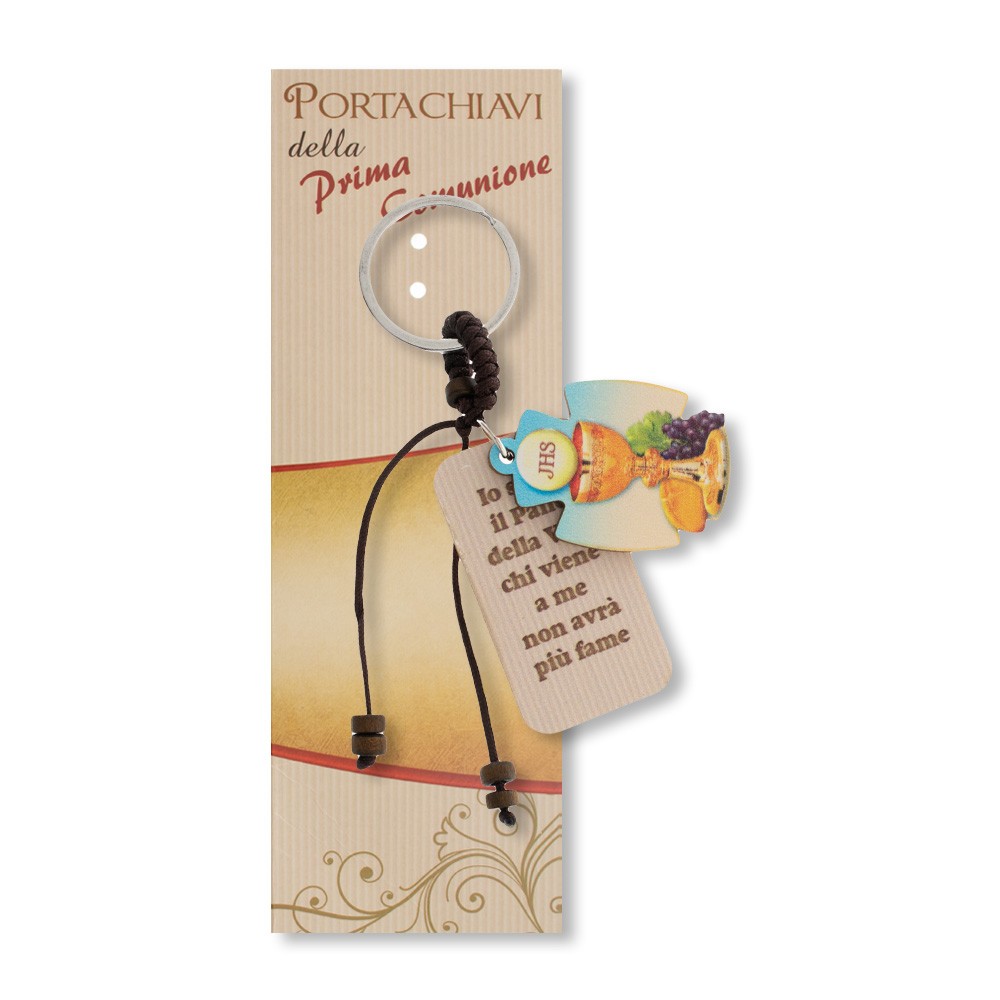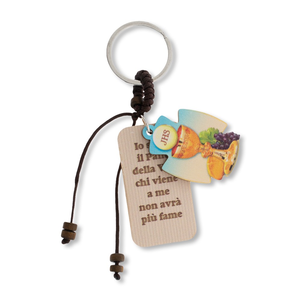 La particolarità del portachiavi sono le le due placche in legno, una sagomata con immagine dei simboli eucaristici della Comunione e l'altra rettangolare con frase stampata "Io sono il Pane della Vita chi viene a me non avrà più fame".