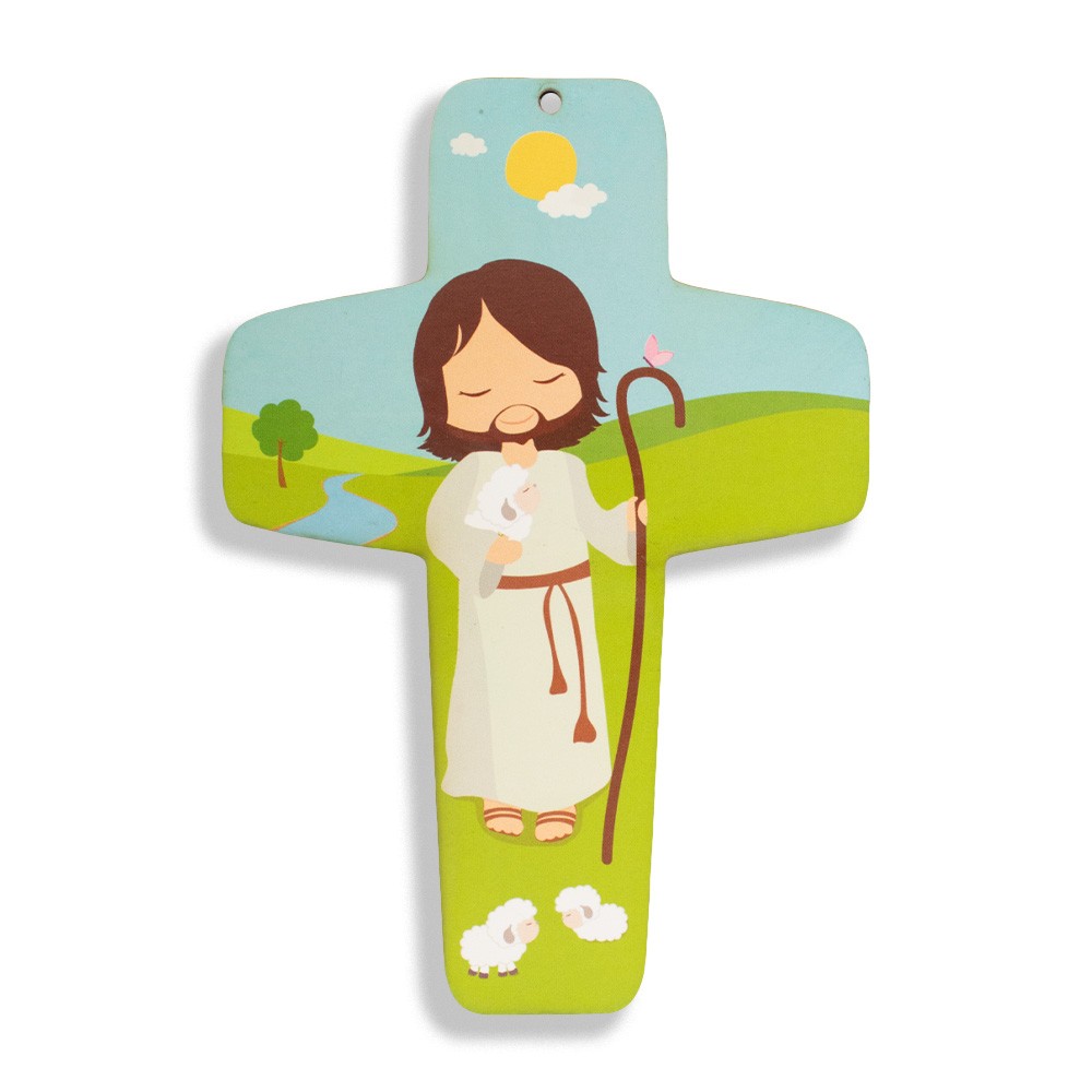 Croce colorata in legno MDF con immagine raffigurata di Gesù Buon Pastore.