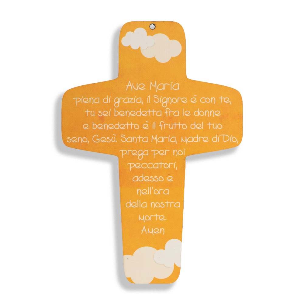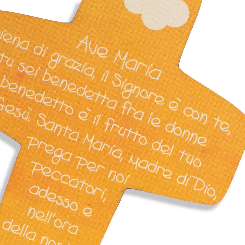 La croce si presenta con fondo arancione, preghiera stampata e due nuvolette decorate.