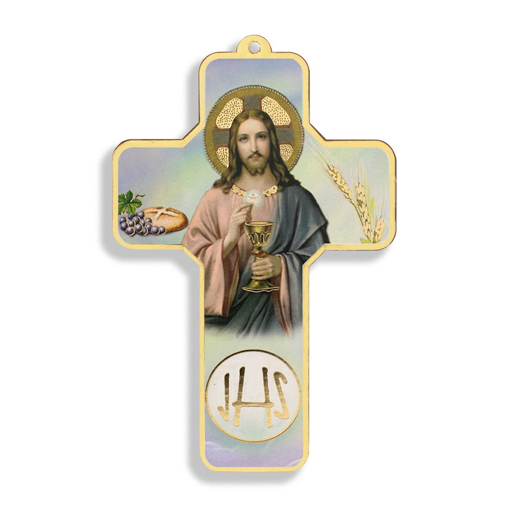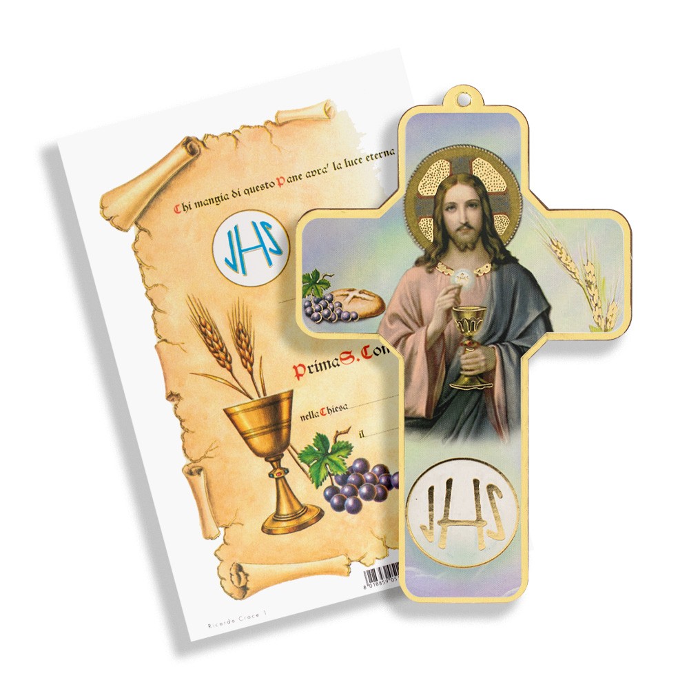 Croce Prima Comunione realizzata in legno MDF con immagine stampata in lamina oro, adatta come ricordino in occasione della Santa Comunione.