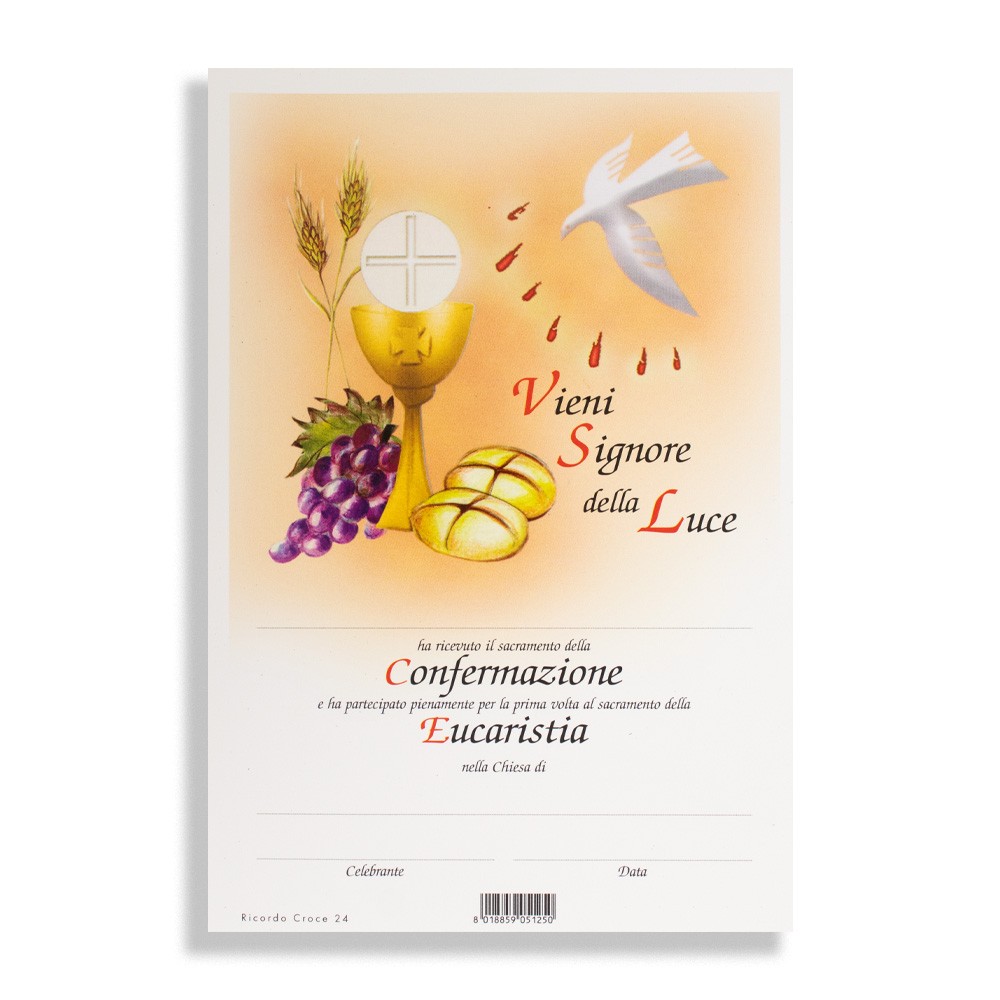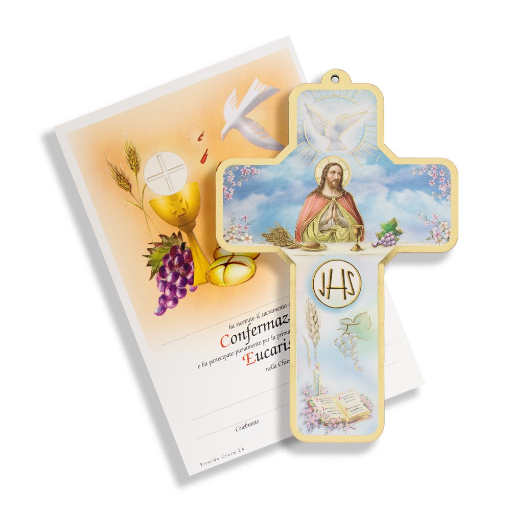 Croce Prima Comunione e Cresima realizzata in legno MDF con immagine stampata in lamina oro, adatta come ricordino sia per la Confermazione che per la Prima Comunione.