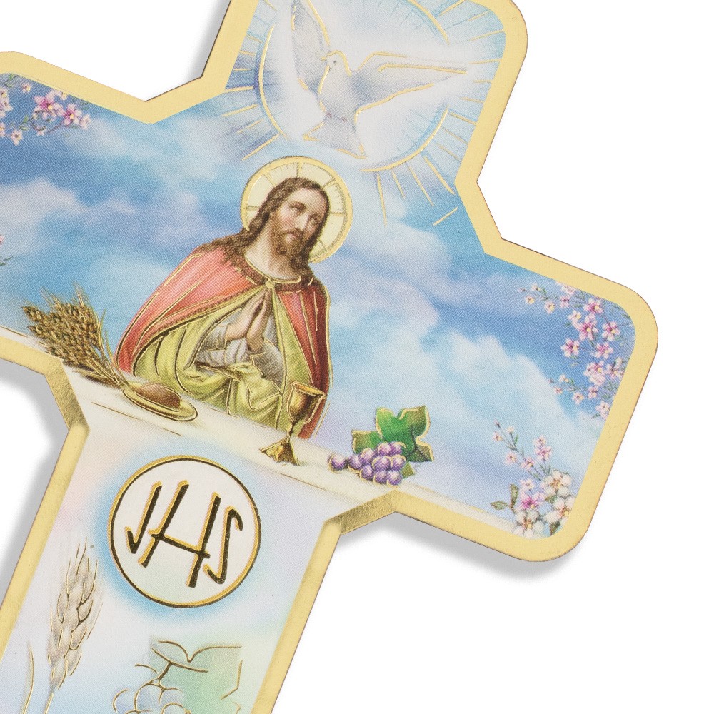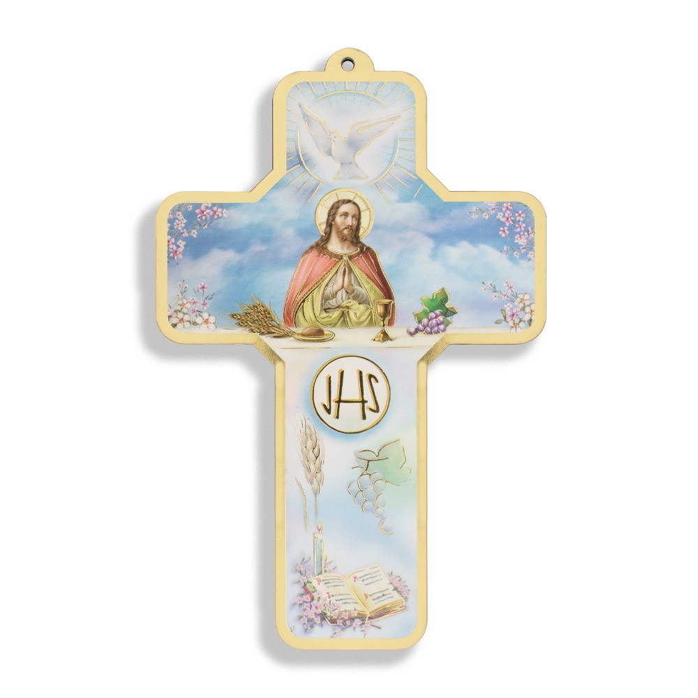 La croce è in legno MDF con decori eucaristici ed è perfetta come ricordino per la Prima Comunione.