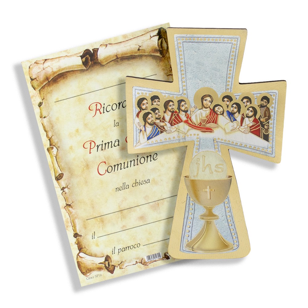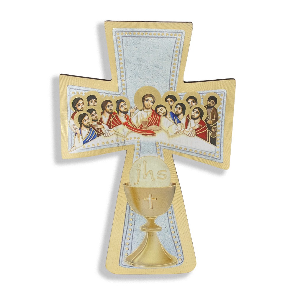 La croce è sagomata realizzata interamente in legno (mdf) con stampa foglia oro, raffigurante l'Ultima cena e i simboli del Sacramento della Prima Comunione.