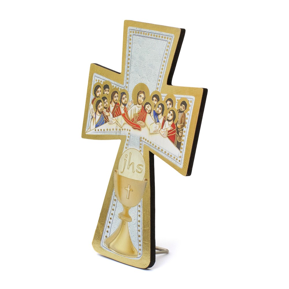 Croce in legno e immagine in foglia oro dell'Ultima Cena.