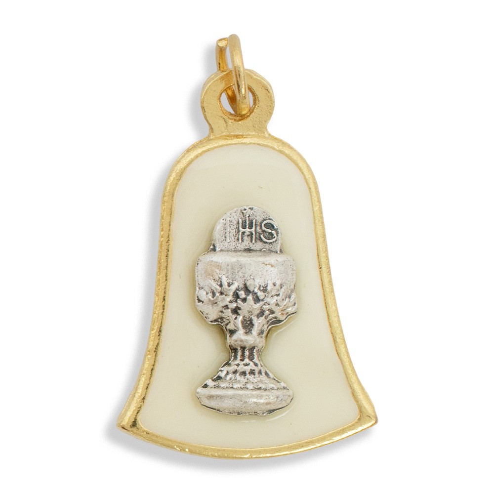 Medaglietta della Prima Comunione a forma di una piccola campana, decorata con calice in rilievo in metallo argentato.