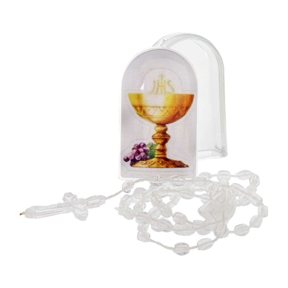 Completa di scatola in plastica con immagine Calice per la prima Comunione.