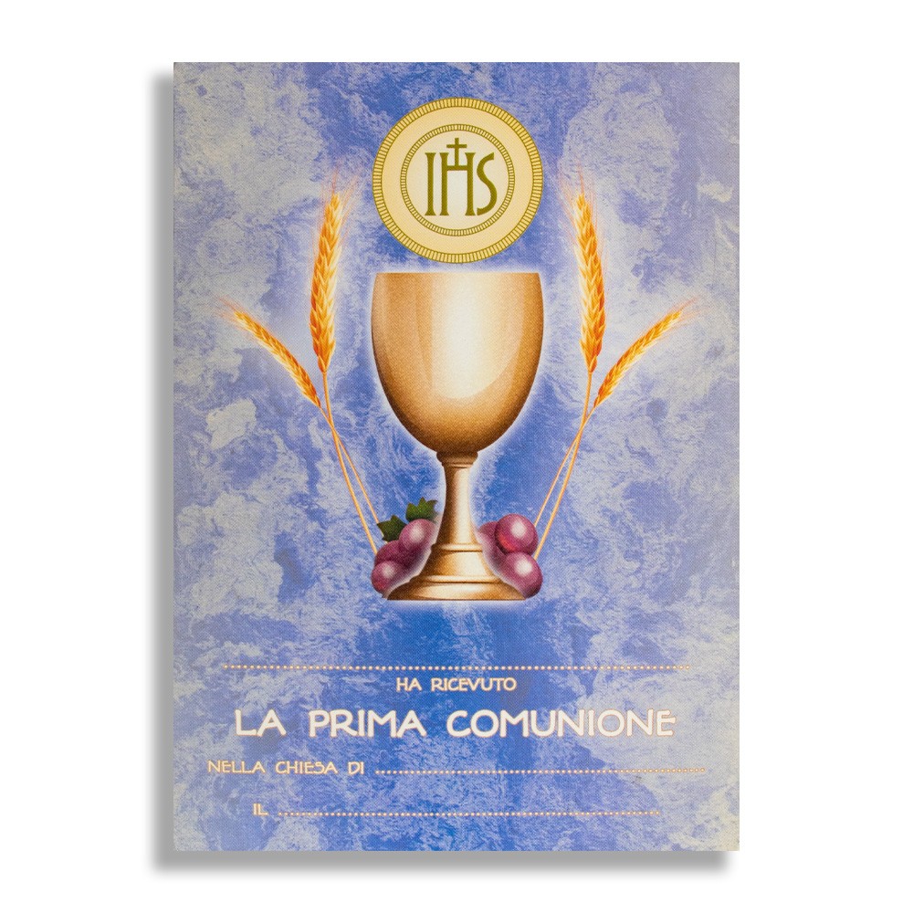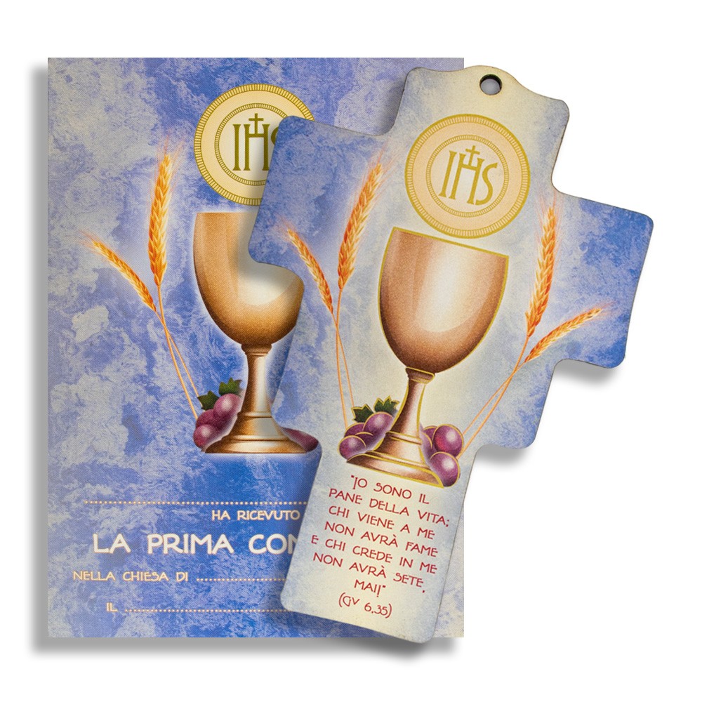 Croce in legno MDF con diploma in ricordo della Prima Comunione.