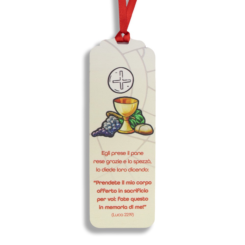 Realizzato in legno e decorato con simboli eucaristici della Prima Comunione e frase " Egli prese il pane rese grazie e lo spezzò, lo diede loro dicendo: "Prendete il mio corpo offerto in sacrificio per voi: fate questo in memoria di me!