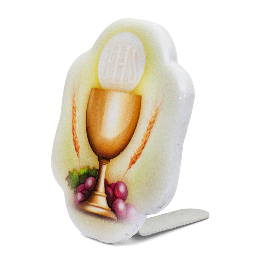 Il pratico supporto in metallo e i colori utilizzati rendono l'articolo perfetto per un ricordino della Prima Comunione.