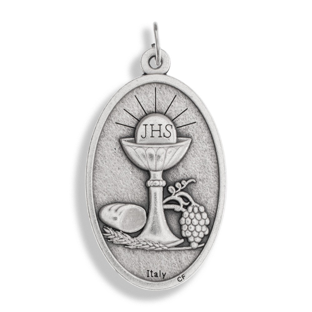 Questa medaglietta è realizzata in metallo argentato ed è decorata con simboli eucaristici in rilievo della Prima Comunione.