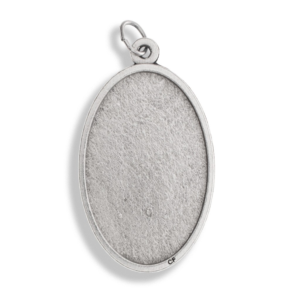 Medaglietta ovale in metallo argentato, alta 4 cm.
