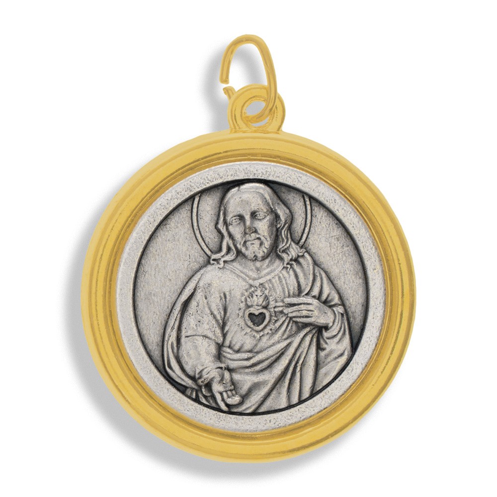 Medaglietta per Prima Comunione decorata da un lato con simboli eucaristici e dall'altro lato l'immagine raffigurata del Sacro Cuore di Gesù.
