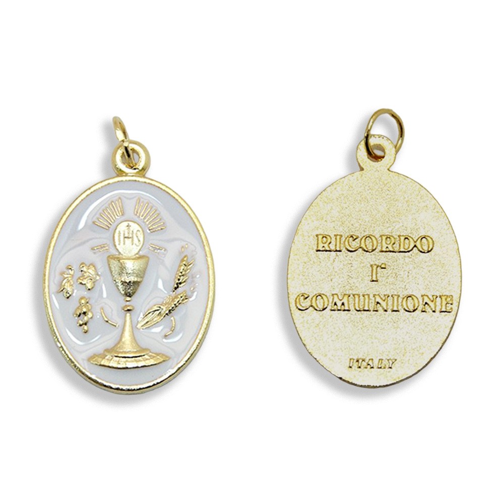Medaglia dorata con smalto bianco e simbolo del Calice (Prima Comunione). Ottimo come regalo per il Sacramento della Prima Comunione.