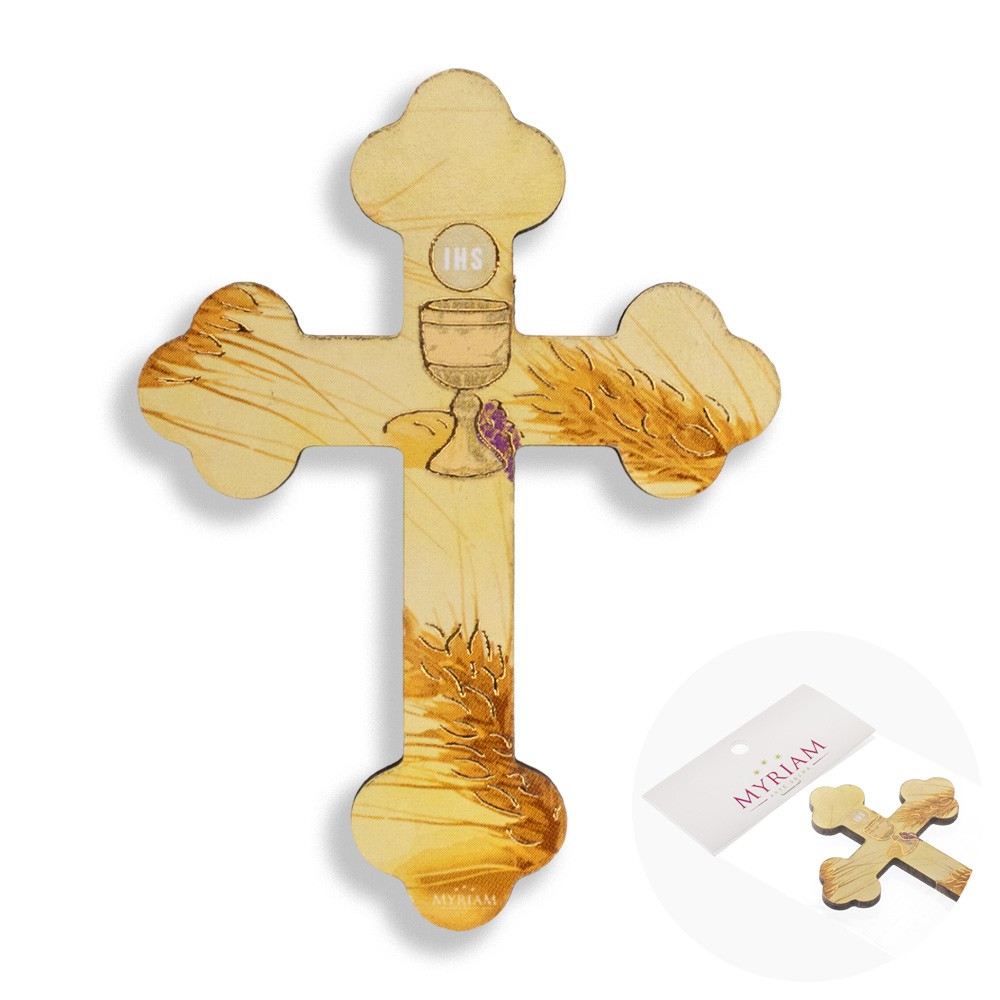 Il magnete è realizzato a forma di mini croce trilobata con immagini stampate raffiguranti i simboli eucaristici della Prima Comunione.