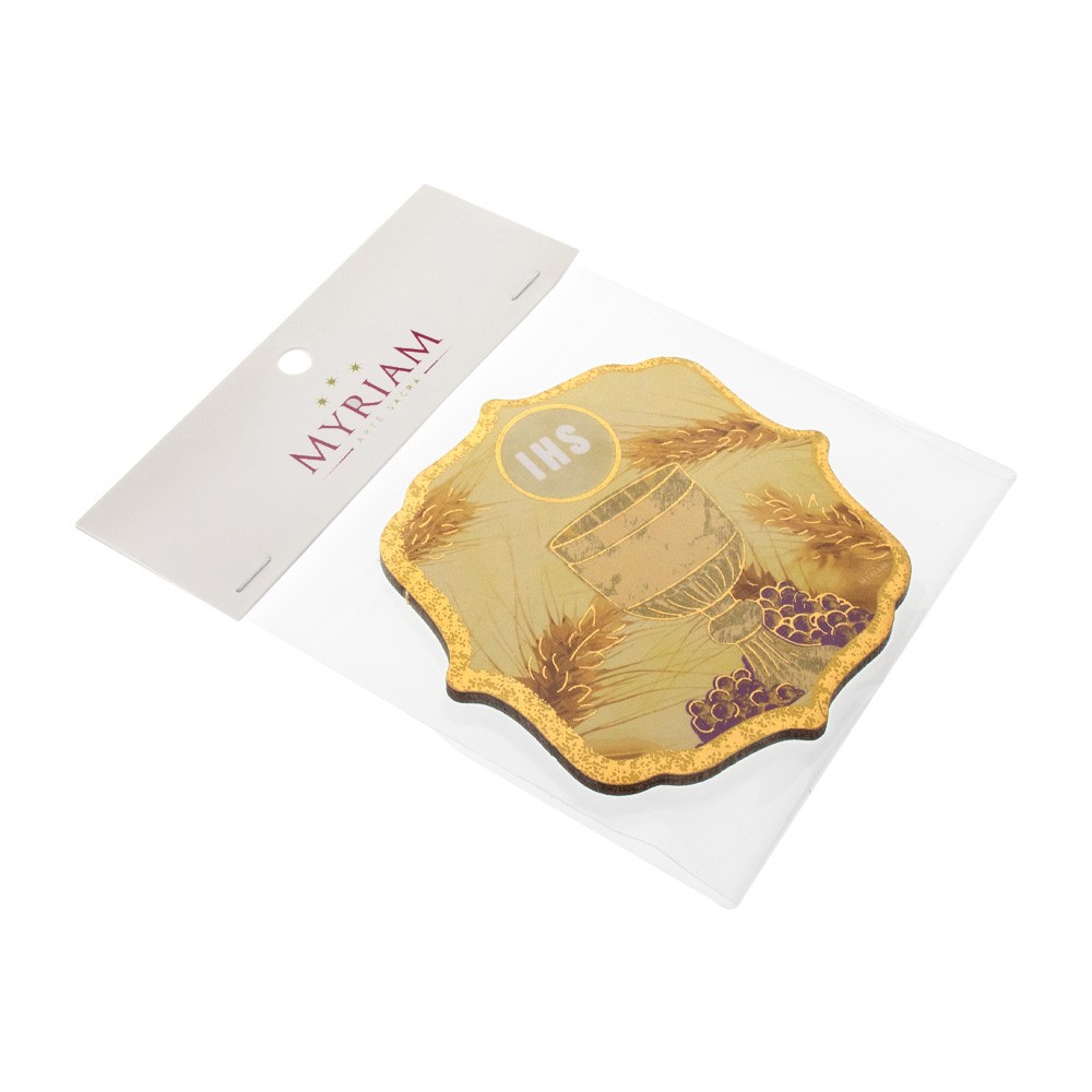 Magnete sagomato e decorato con i simboli eucaristici della Prima Comunione.