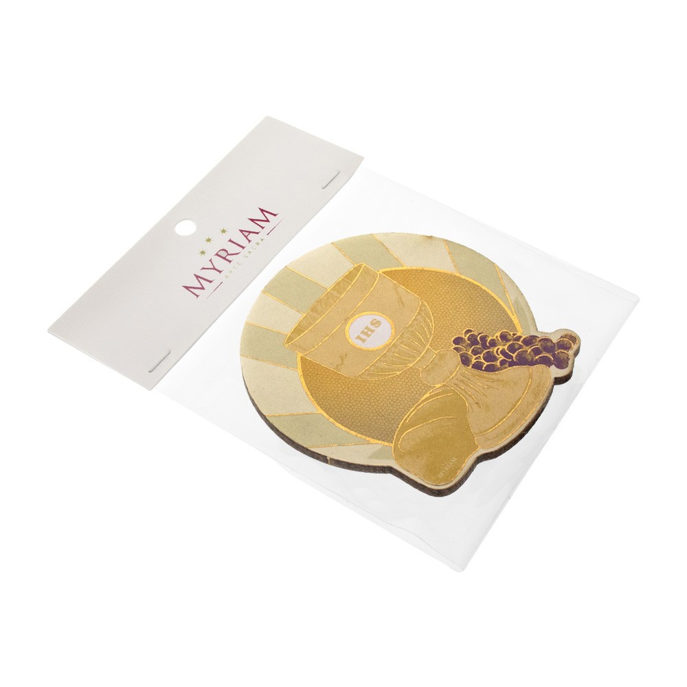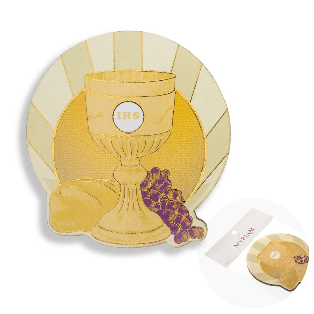 Magnete sagomato con decorazioni raffiguranti i simboli eucaristici della Prima comunione.