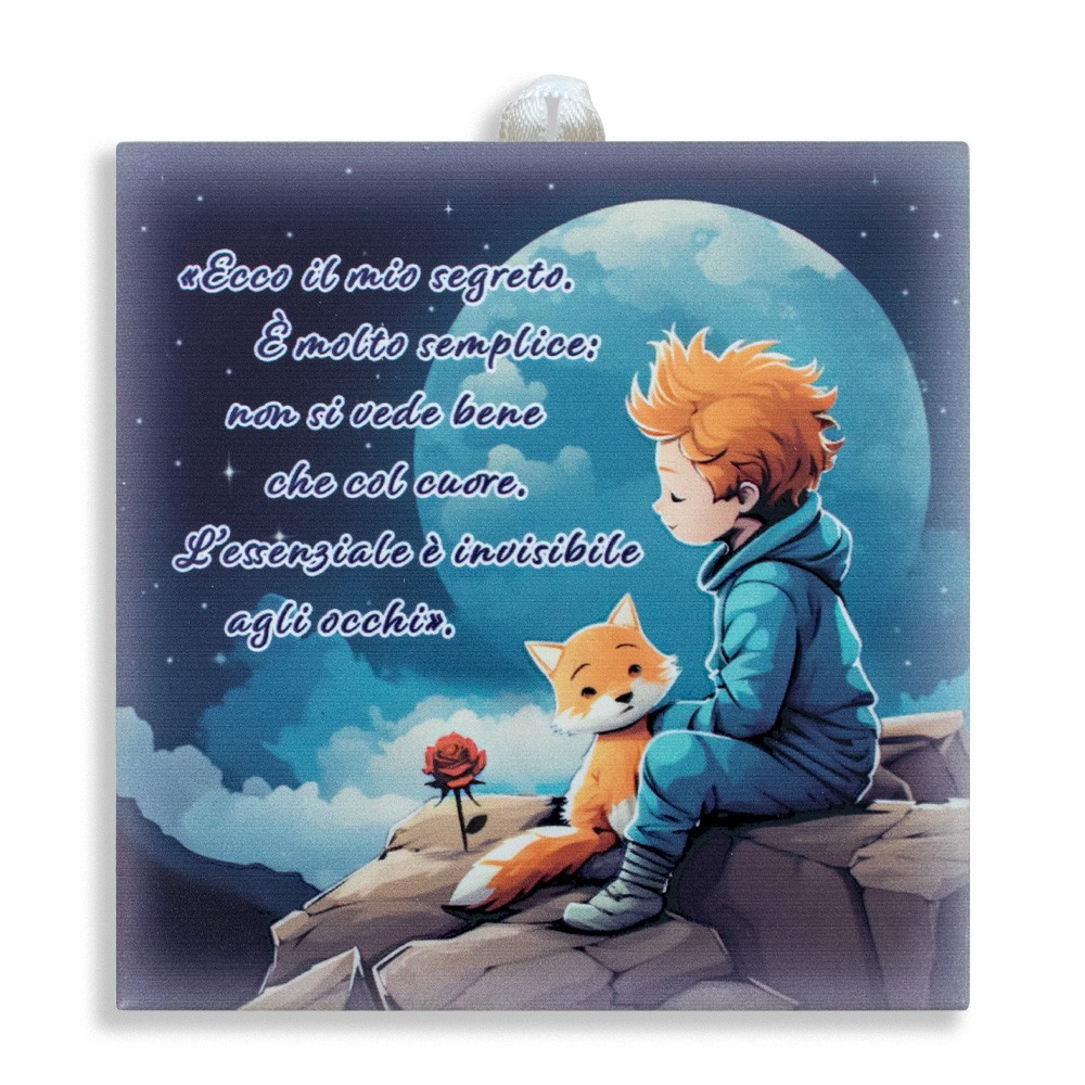 Piastrella del Piccolo Principe con immagini e frase stampata.