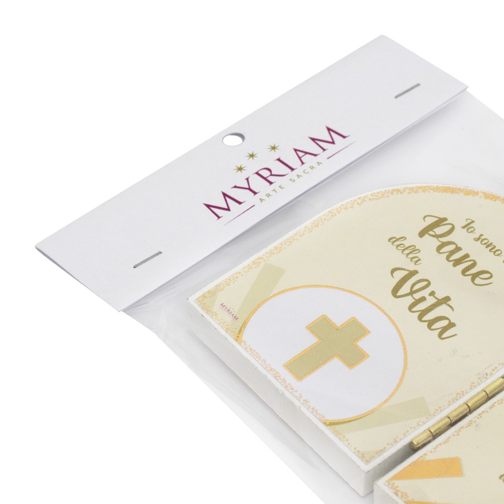 Realizzato in MDF da un lato sono raffigurati i simboli eucaristici della Comunione e dall'altro lato vi è stampata la frase " Questo è il pane che discende dal cielo, affinché chi ne mangia nn muoia. Io sono il pane vivo, disceso dal cielo".