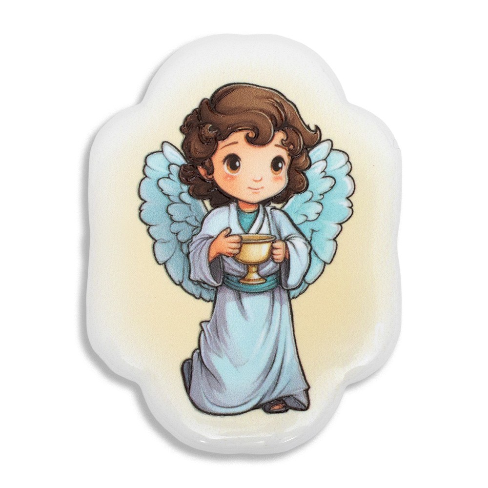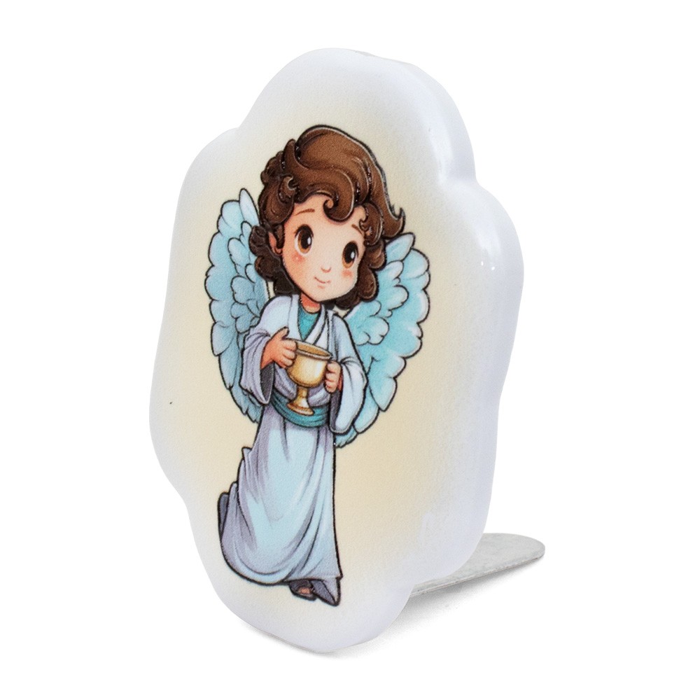 Questo carinissimo magnete è a forma di nuvola realizzato in resina porcellanato raffigurante un angioletto con in mano un calice.