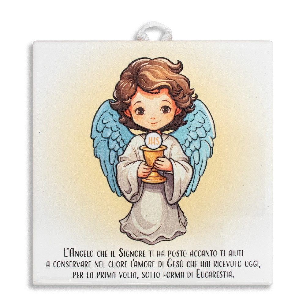 Piastrella Prima Comunione con angioletto decorato, realizzata su tavoletta in ceramica, munita di nastrino bianco per poterla appendere.