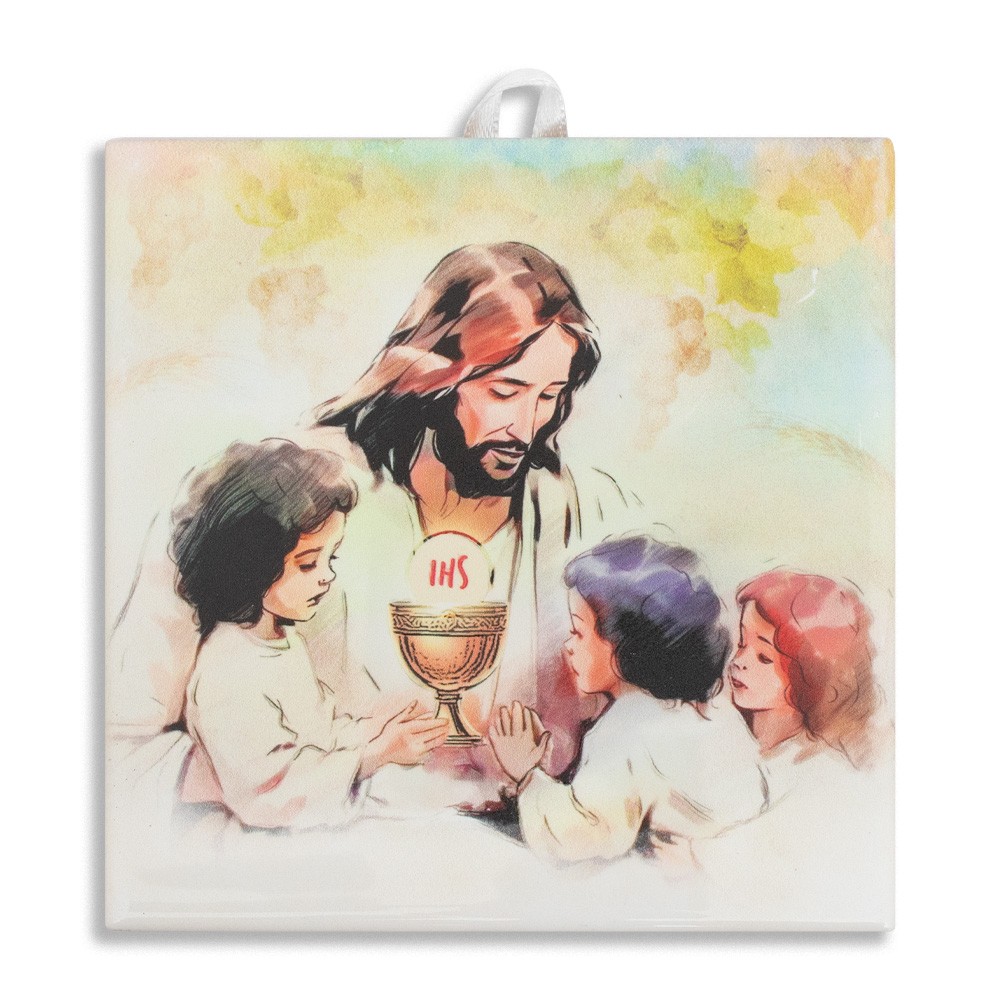 Piastrella in ceramica Prima Comunione NOVITA' 2025, decorata con immagine raffigurata di Gesù con i pargoli. Completa di nastrino bianco per poterla appendere.