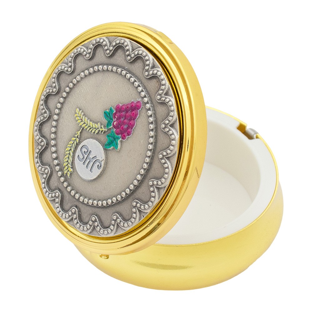 Porta rosario tondo Prima Comunione in metallo con finitura oro e serigrafato.