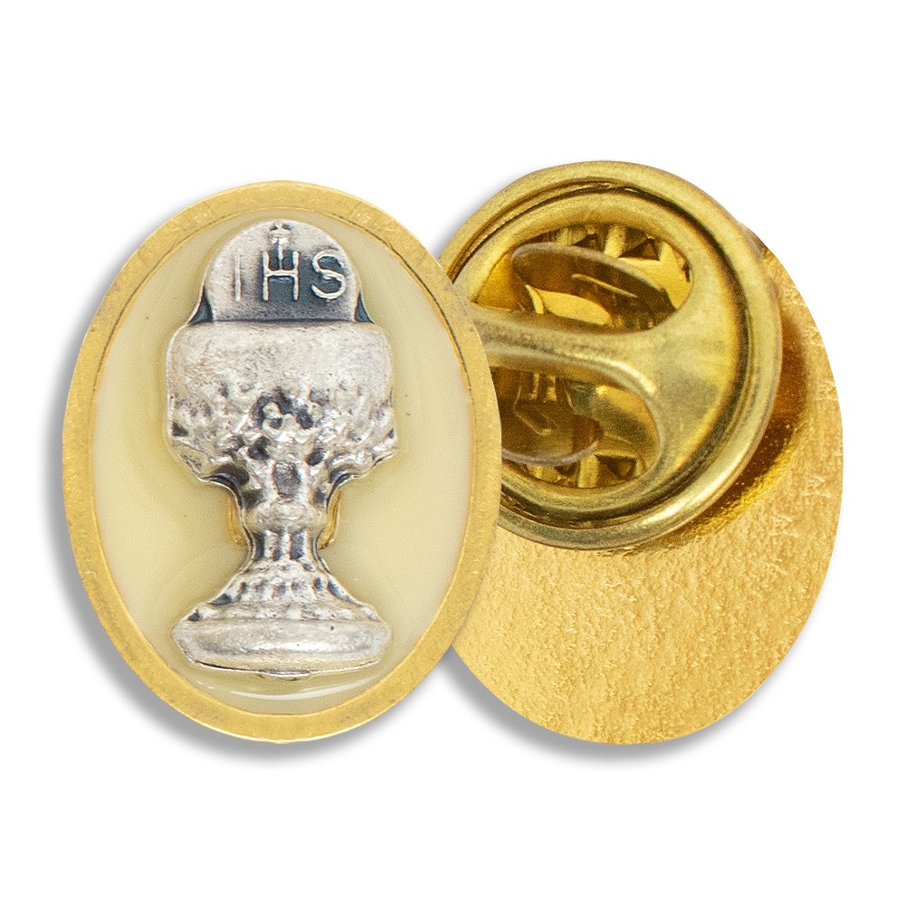 La spilletta è in metallo dorata e smaltata, mentre il calice è in metallo argento.