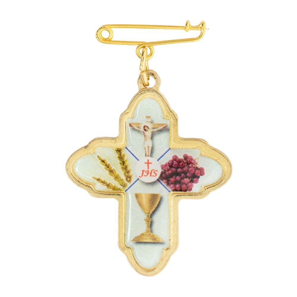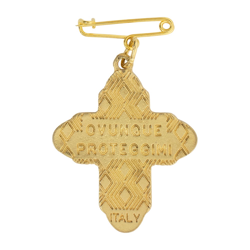 Spilla in metallo a forma di croce smaltata con simboli eucaristici. Suk retro della spilletta vi è la scritta OVUMQUE PROTEGGIMI.