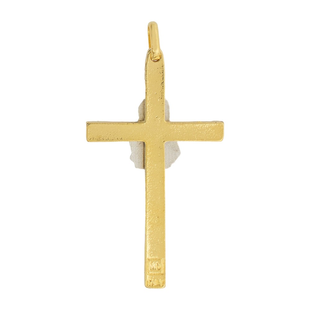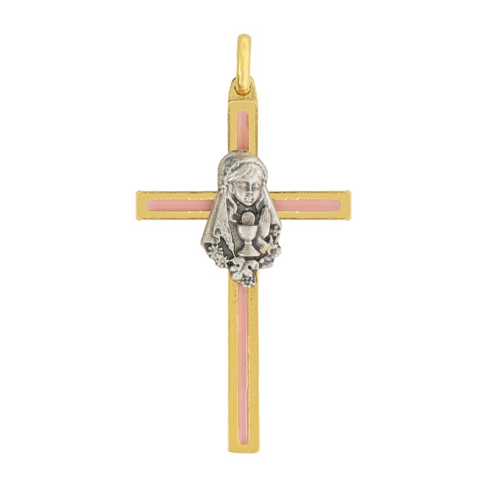La croce è in metallo tono dorato con smalto rosa completa di anello superiore apribile.